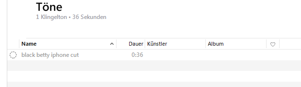 Ich habe probiert, den Klingelton mit einer älteren iTunes Version von letztem Jahr zu synchronisieren, klappt aber nicht. In der Rubrik "Töne" wird der Klingelton hellgrau angezeigt mit einem gepunkteten Kreis links neben dem Dateinamen. Mehr passiert da nicht. Mit der aktuellen iTunes Version das gleiche.