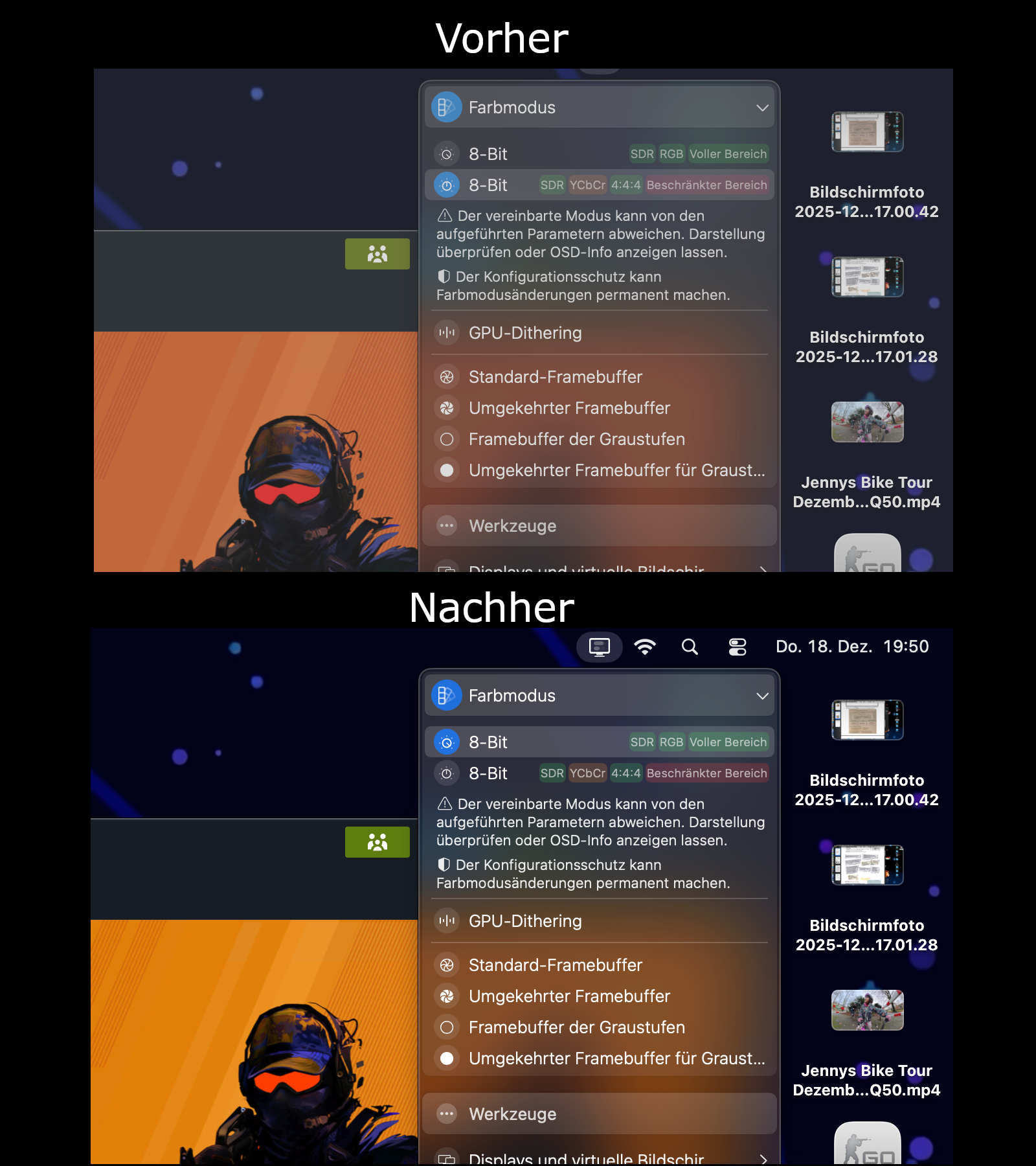 Allerdings habe ich einen bedingt guten Workaround gefunden: Ich habe das Programm Better Display installiert. Hier kann ich den Farbmodus ändern. Die Änderung von SDR-YCbCr-4:4:4 beschränkter Bereich zu SDR-RGB-Voller Bereich sorgt dafür, dass die Farben auf Anhieb richtig sind. Juhu...