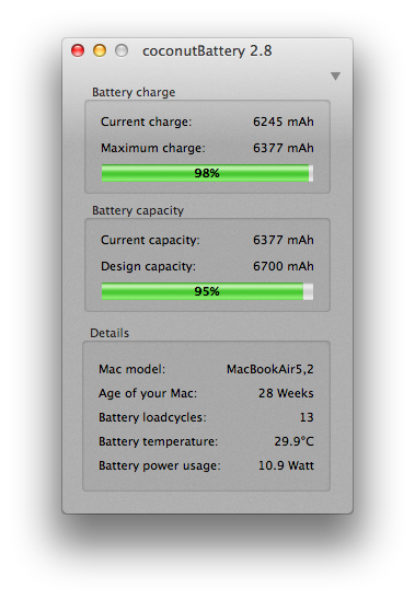 Anhang : Coconut Battery Screenshot, 3 Minuten nach Komplettladung