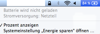 Auch wird das MacBook manchmal geladen. Gestern wurde es vom Thunderbolt aufgeladen, ich habe es abends rausgenommen, gesurft und jetzt wird es wieder nicht geladen und steht bei 84%.