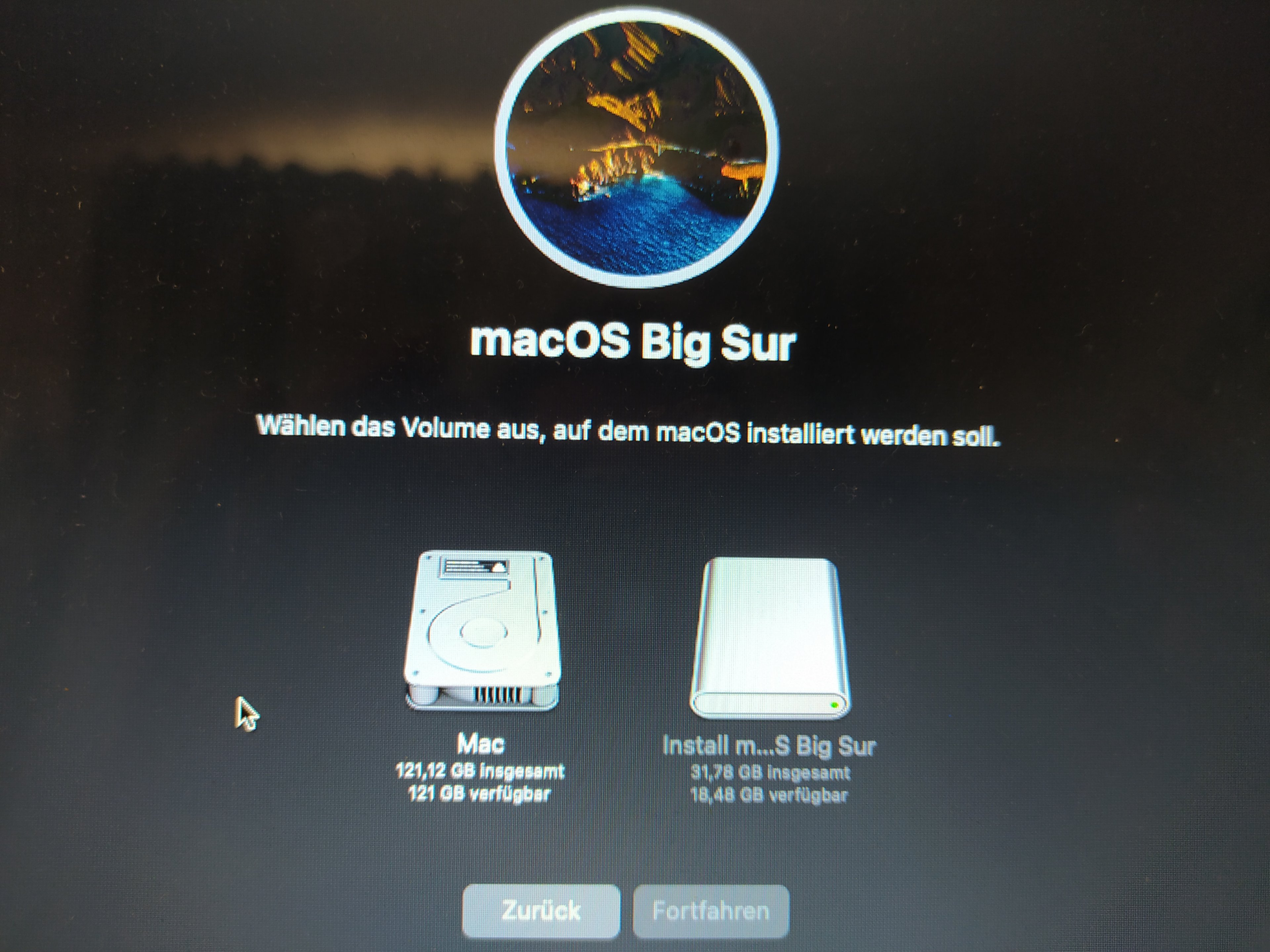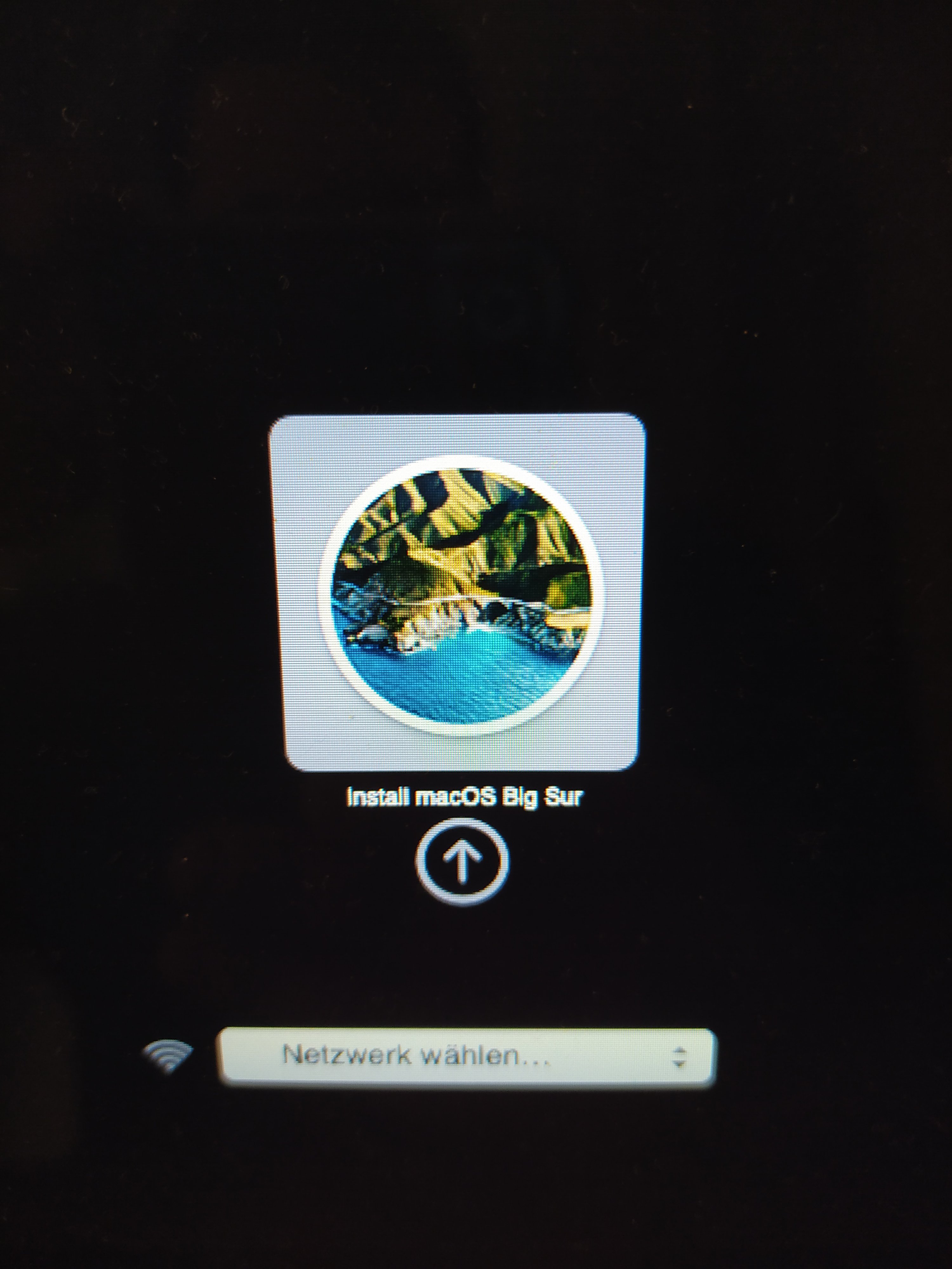 Achso, ja. Du hast ja keine andere Partition mehr, da kommt jetzt sowieso nur der USB-Stick. Klick drauf bzw. drück Enter und passt schon. Mit dem Netzwerk kannst du dich trotzdem verbinden, da Big Sur eine Onlineverbindung will beim Installieren.