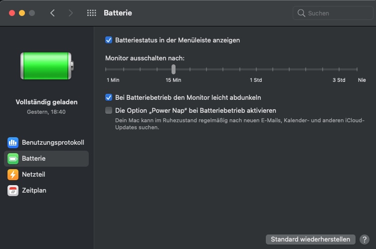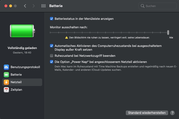 Angehängt habe ich Screenshot von der Batterie Option. Bisherige Veränderungen brachten keinen Erfolg. Die Einstellungen beziehen sich ja auch primär auf das Macbook ohne extern angeschlossenes Display, oder?