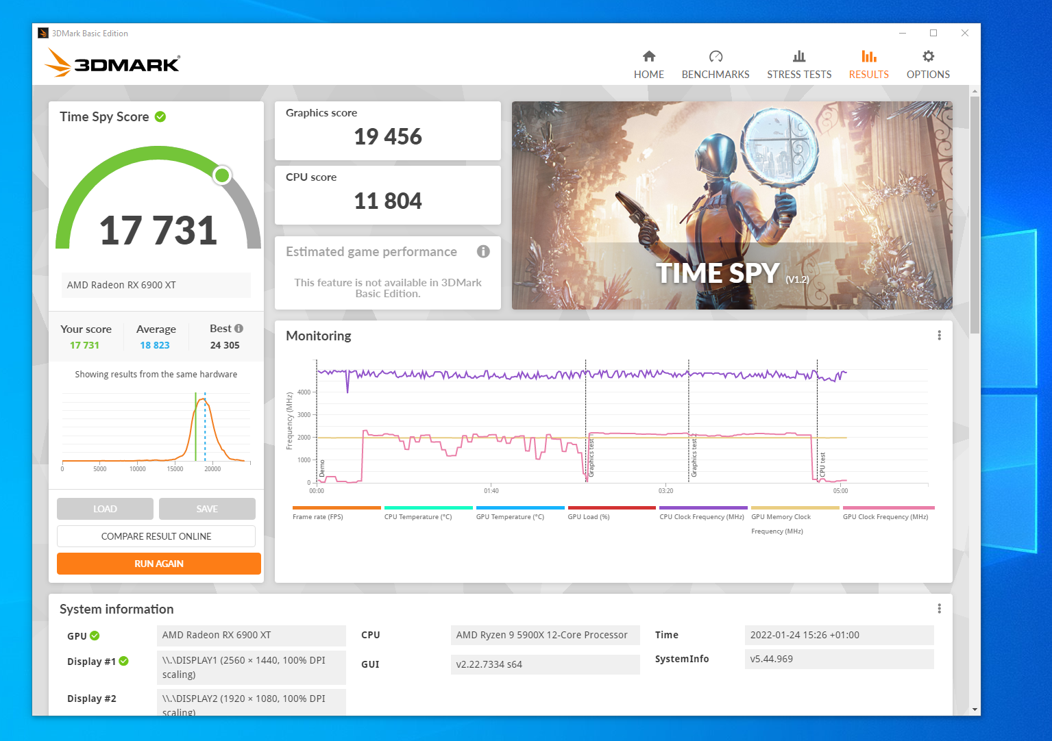 Was mir jetzt grade erst aufgefallen ist: Du hast laut TimeSpy zwei unterschiedliche Monitore. Wenn diese auch noch auf unterschiedlichen Frequenzen laufen, kann das einen deutlichen Einfluss auf die Performance haben. Stecke den kleineren ab und schau dir die FPS dann nochmal an.