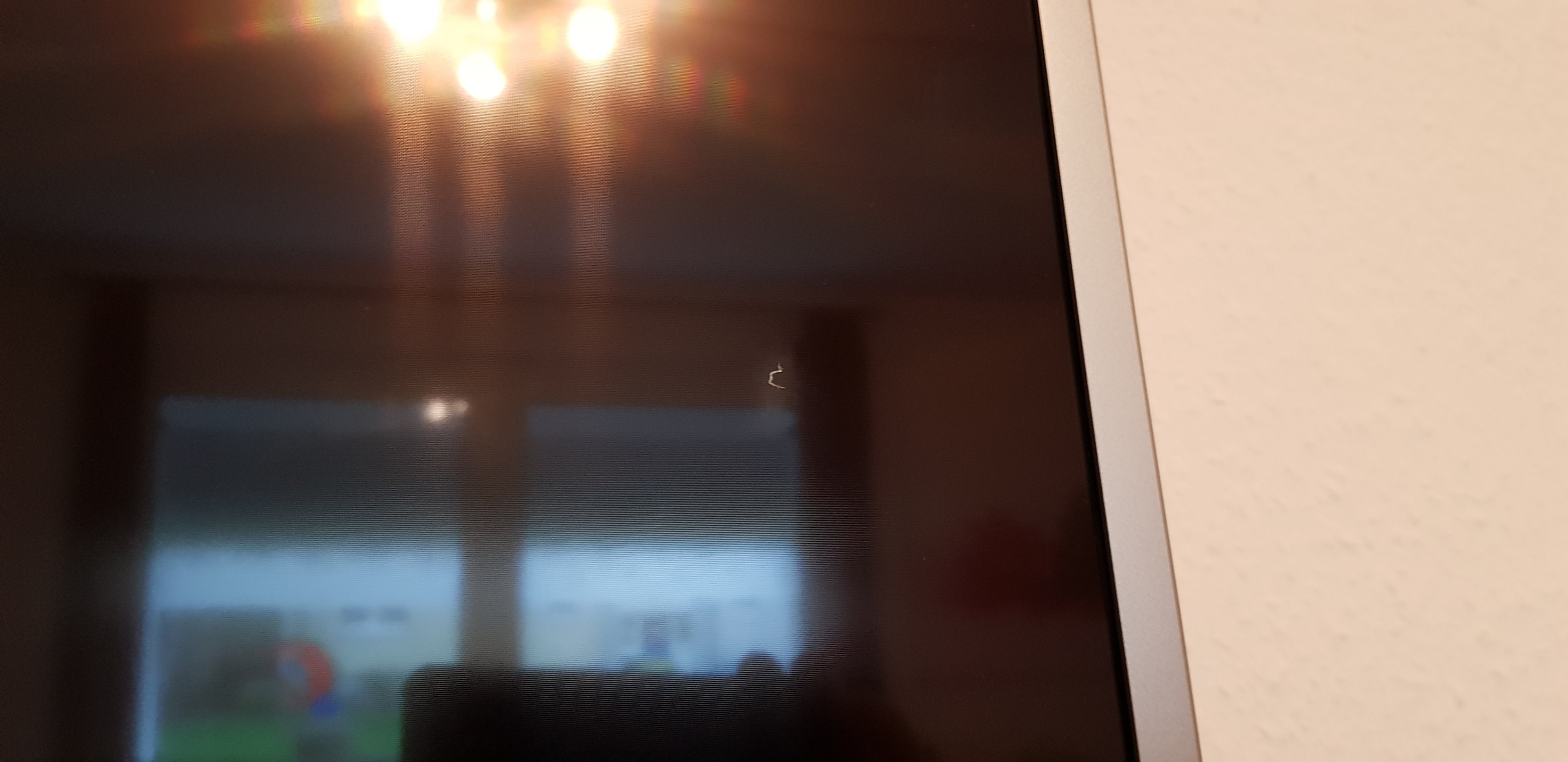 Ja, die helle Stelle wirkt wie ein schatten wenn das Bild weiß ist und bei Farbe spiegelt das wenn Licht durchs Fenster scheint. Wenn er aus ist, sieht es auf dem Schwarzen Hintergrund aus wie ein kräftiger Fingerabdruck, der aus jder Entfernung zu sehen ist.