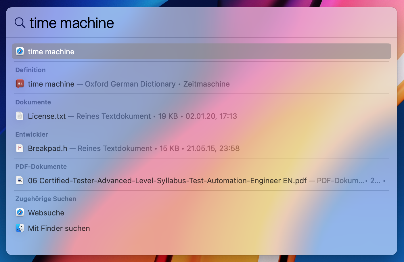Außerdem ist Spotlight noch immer unbrauchbar, da es nicht mehr alle Dinge anzeigt wie zuvor. Beispielsweise die Eingabe von Unterpunkten der Systemeinstellungen funktioniert nicht "Bedienungshilfen" oder "Time Machine". Genauso werden nicht mehr alle Apps dort angezeigt. Eingabe von "Systemeinstellungen" gibt mir eine Websuche oder Suche im Finder, bei "Aktivitätsmonitor" das gleiche. Hingegen in der Suche im Launchpad findet er alle Apps.