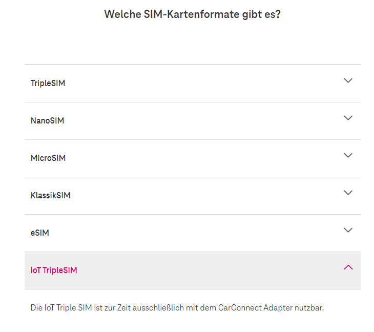 ich wollte mir eben eine MultiSIM für genannten Vertrag bestellen, das habe ich aber erst einmal gelassen da dort lediglich als verfügbarer Typ "TripleSIM IOT" und eSIM auswählbar ist. Ich benötige eine "normale" TripleSIM für ein Tablet und laut eurem FAQ sind die "TripleSIM IOT" nur mit CarConnect Sticks nutzbar.