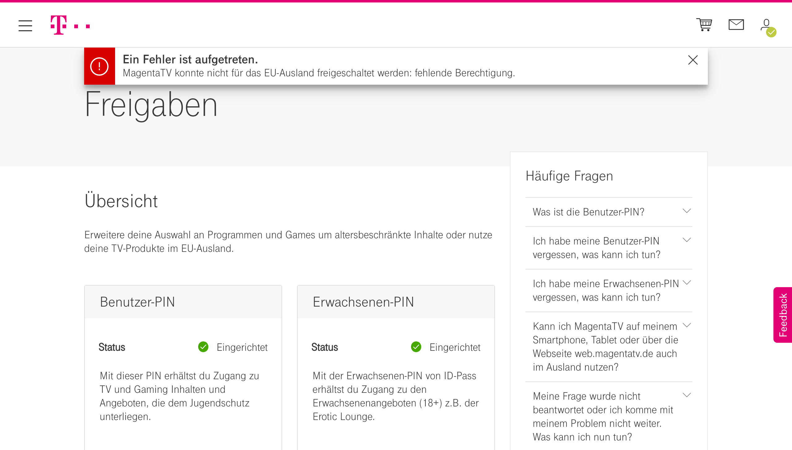 ich bin bis Ende nächster Woche in Norwegen unterwegs. Würde dort gerne auch MagentaTV nutzen. Bin bereits in Norwegen. Leider sagt die App, dass ich die Nutzung aus dem Ausland erst freischalten muss. Das habe ich im Kundencenter versucht, leider bekomme ich eine Fehlermeldung von wegen fehlender Berechtigung (siehe Screenshot)