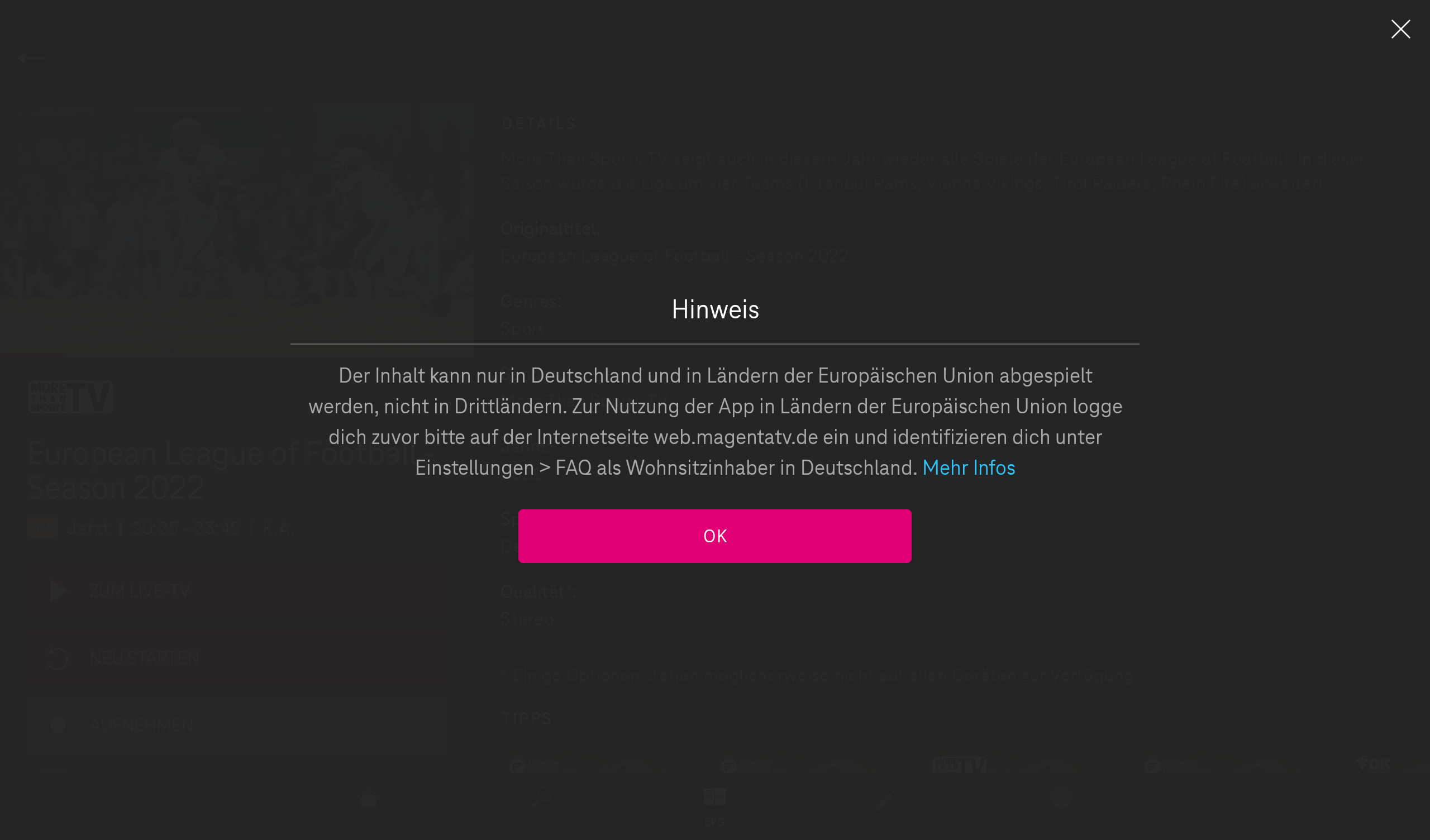 Merkwürdigerweise funktioniert MagentaTV per Chromebrowser auf meinem Samsung Tab S6, aber die App vermeldet immer noch, dass ich die Nutzung aus dem Ausland aktivieren muss (siehe anderer Screenshot).
