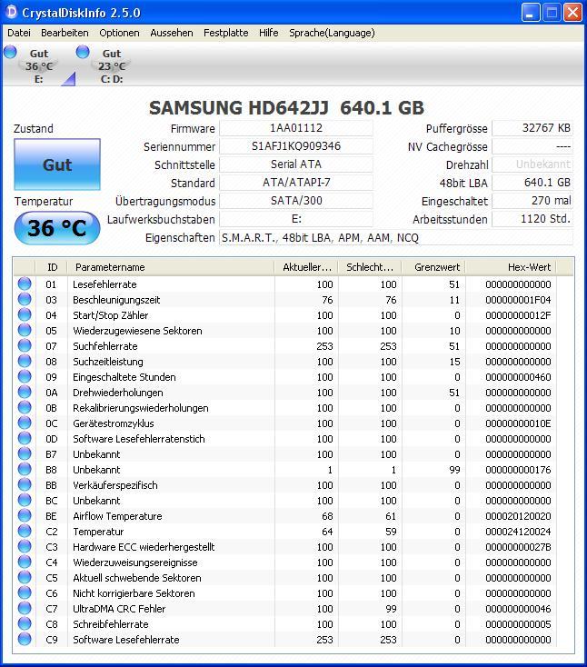 Habe das Prog. "Crystal Disk Info 2.5.0" benutzt und das sagt der Zustand der Platte