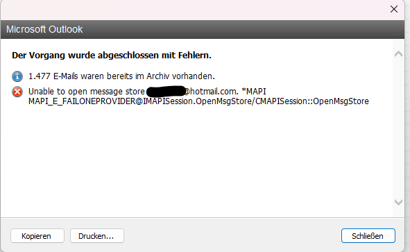 Ich habe neuerdings ein Problem mit Mailstore. Ich habe jahrelang meine *@hotmail.com Adresse archiviert. Jetzt geht es leider nicht mehr. Ich bekomme eine Fehlermeldung, mit der ich nicht wirklich was anfangen kann. Auch das Netz hilft mir nicht weiter oder ich war einfach nur zu unfähig. Mailstore ist auf dem neusten Stand. Kann mir hier vielleicht jemand Hilfestellung geben?