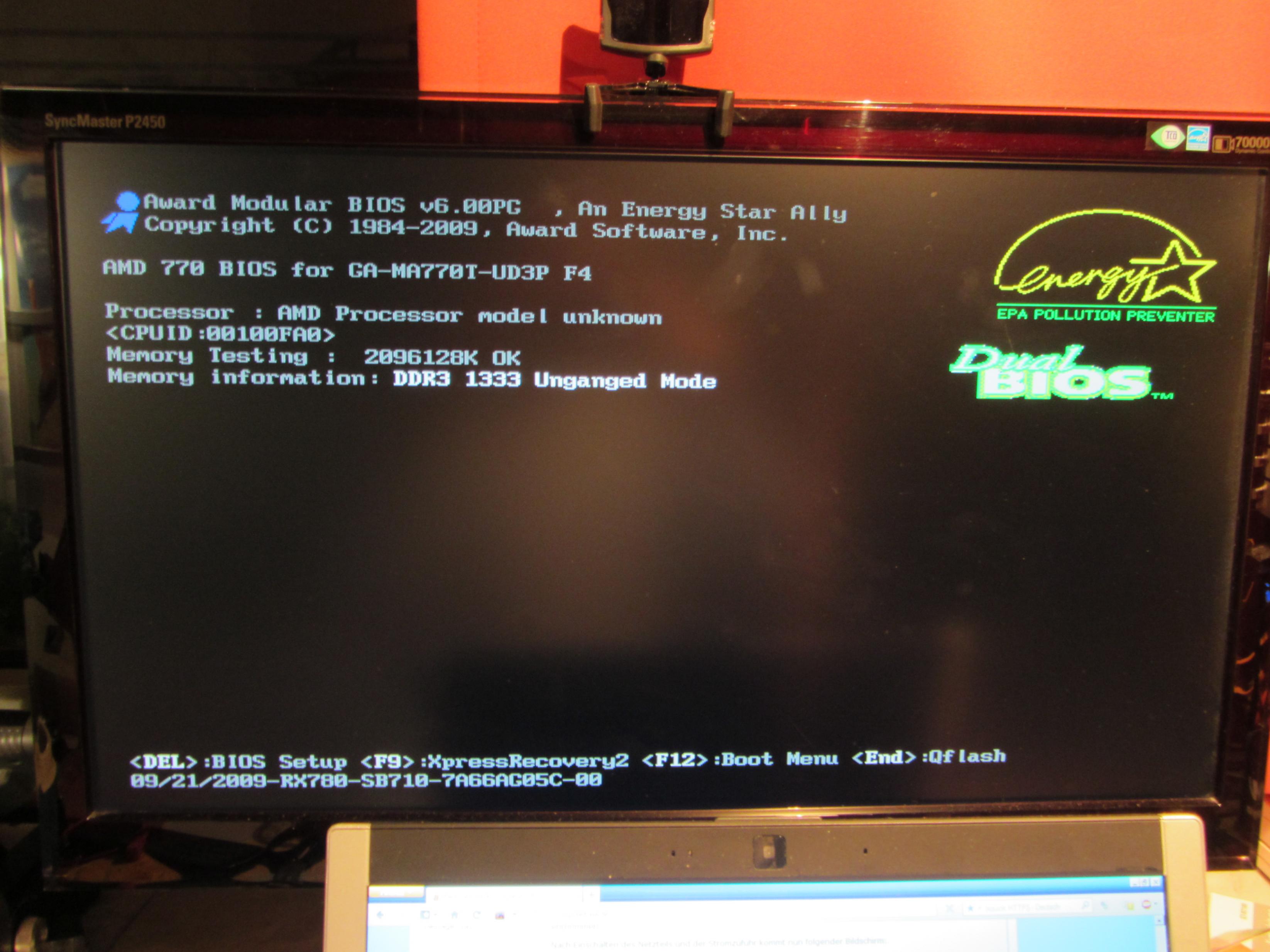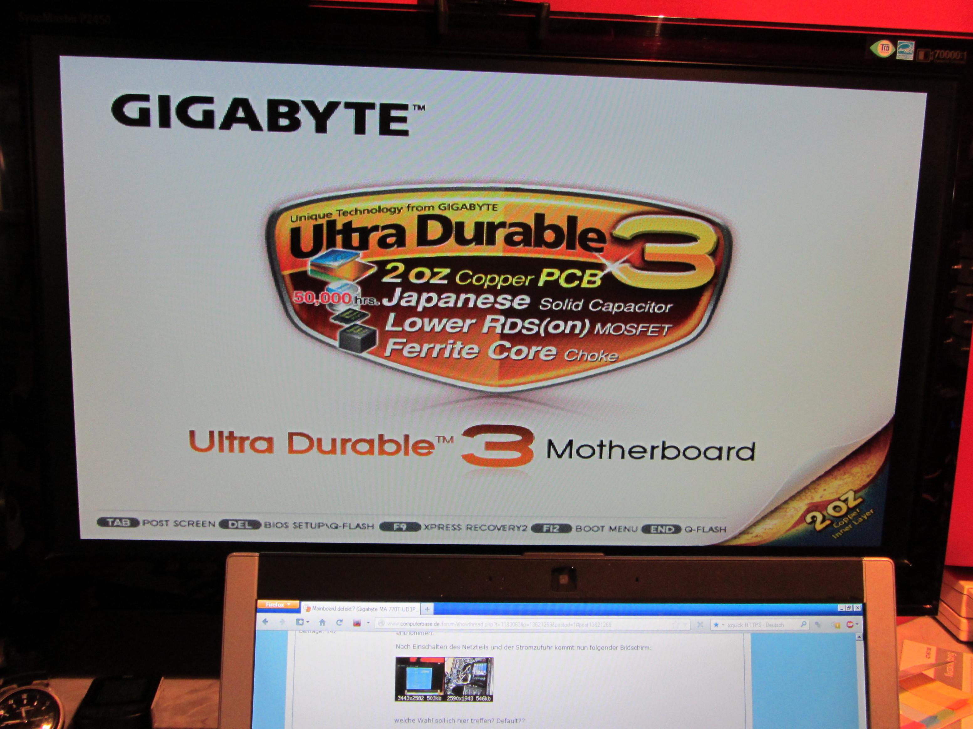 Mein System: Board: Gigabyte MA 770T UD3P rev 1.0 Bios F5; Prozessor: Phenom 2 x6 3,1GHz inkl. Mugen 2-Kühler; Speicher: 2x2048MB G-Skill Ripjaws cl7/7/7/21 1333MHz; Grafikkarte: ATI 4890 Vapor x 1GB; Festplatten: Samsung Sata 500GB f3 7200u/min(Systemplatte); Seagate Baracuda ATA 500GB + 160GB Betriebssystem: Windows 7 64bit; Bildschirm: Samsung 226BW 22" 1680x1050