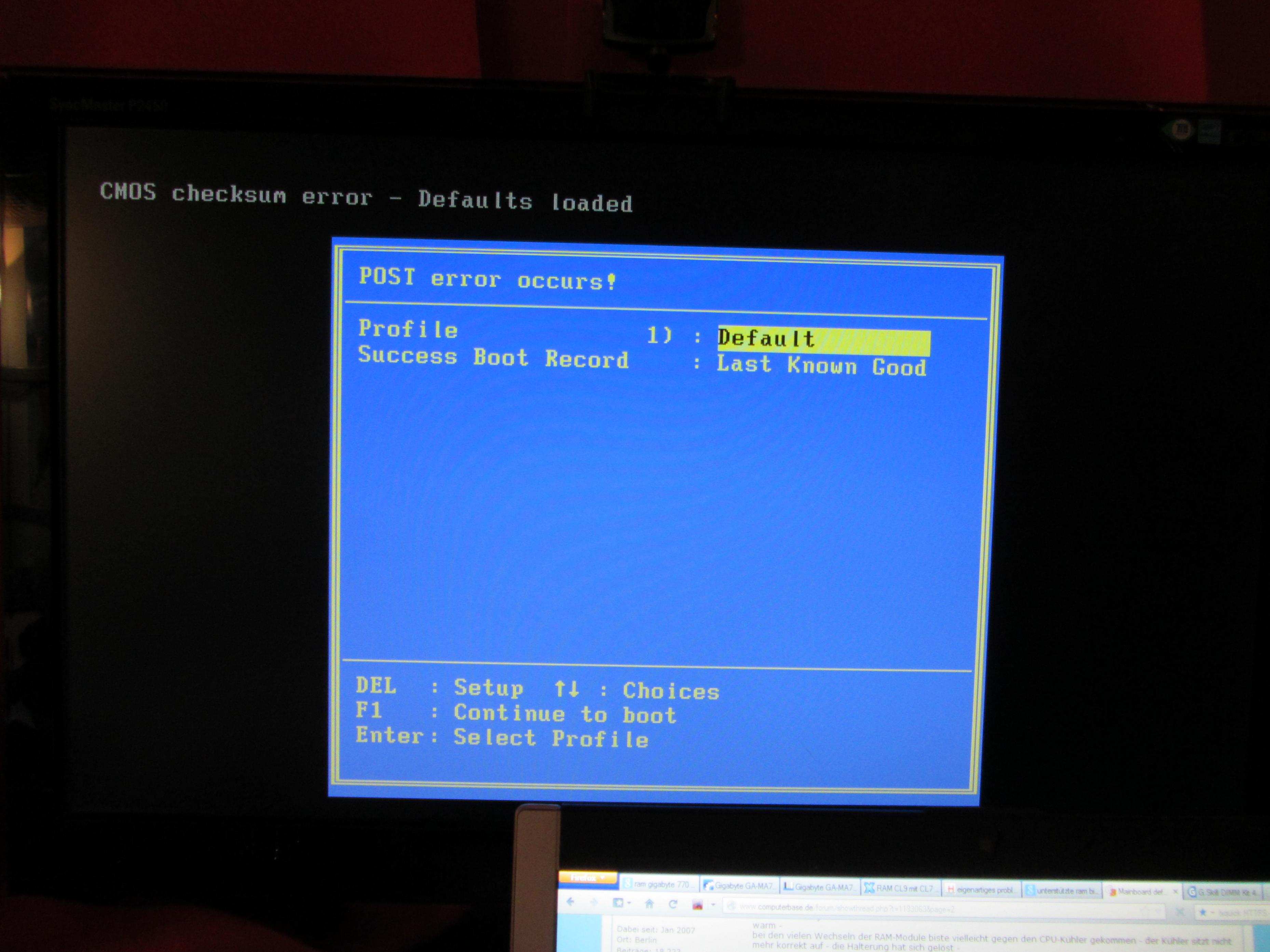 nach dem Neustart habe ich den USB-Stick zum flashen eingesteckt und dann ist der PC im blauen Auswahlmenu eingefroren als ich Default gewählt und mit Eingabetaste bestätigt hatte.