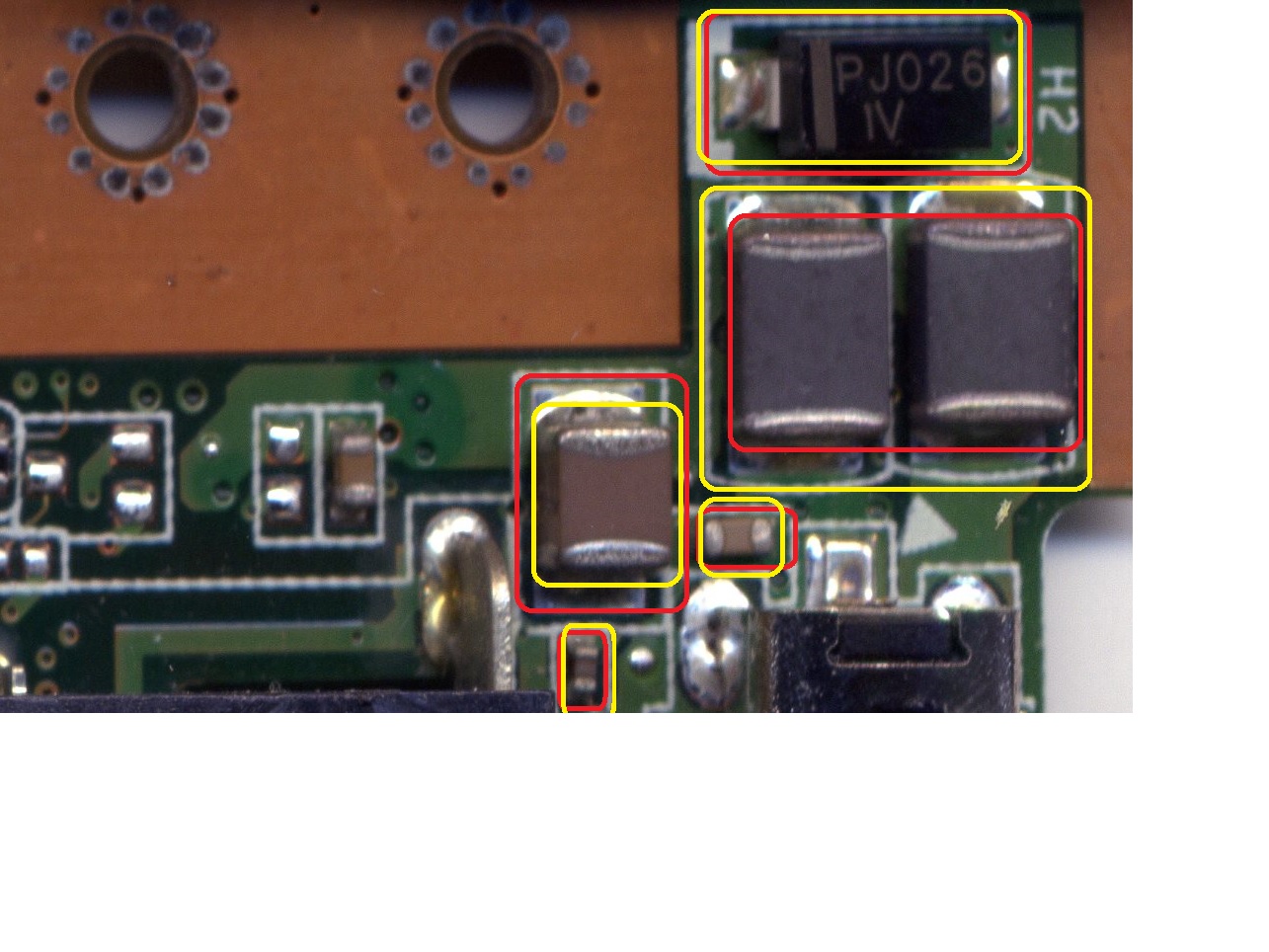 Das schwarze Teil oben ist eine Diode. Mit einem Ohmmeter (Durchgangsprüfer) messen, wenn du auf beiden Seiten einen Durchgang misst, ist die Diode kaputt. Du solltest sie aber dafür auslöten. Wenn du keine Erfahrung im SMD-Löten hast, dann lass es lieber und gib es jemandem zur Hand der sich darin auskennt.