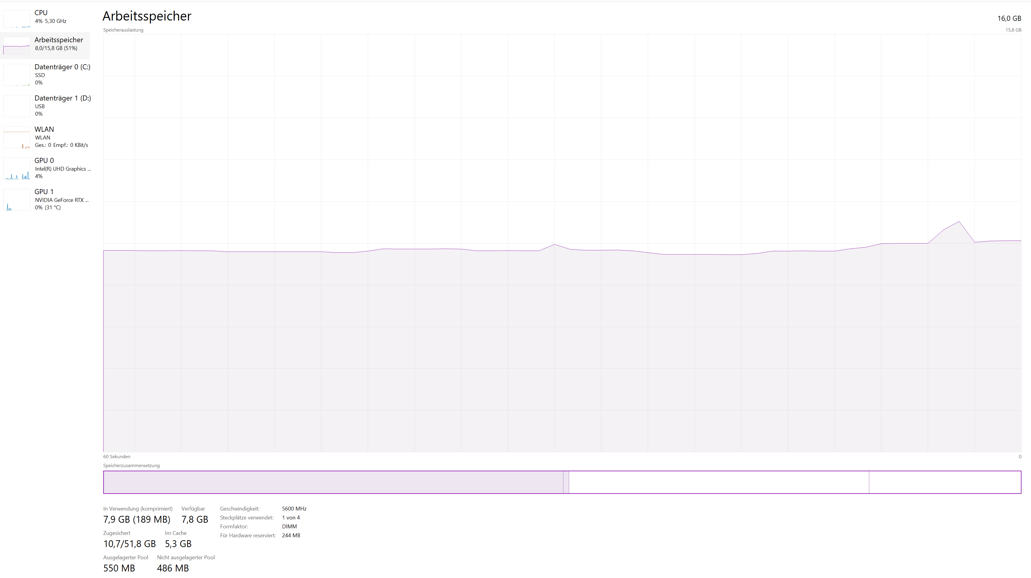 - Arbeitsspeicher (RAM): DDR5 Corsair 16GB x 2 = 32GB 5600MHz (zeigt Blos 16GB an)