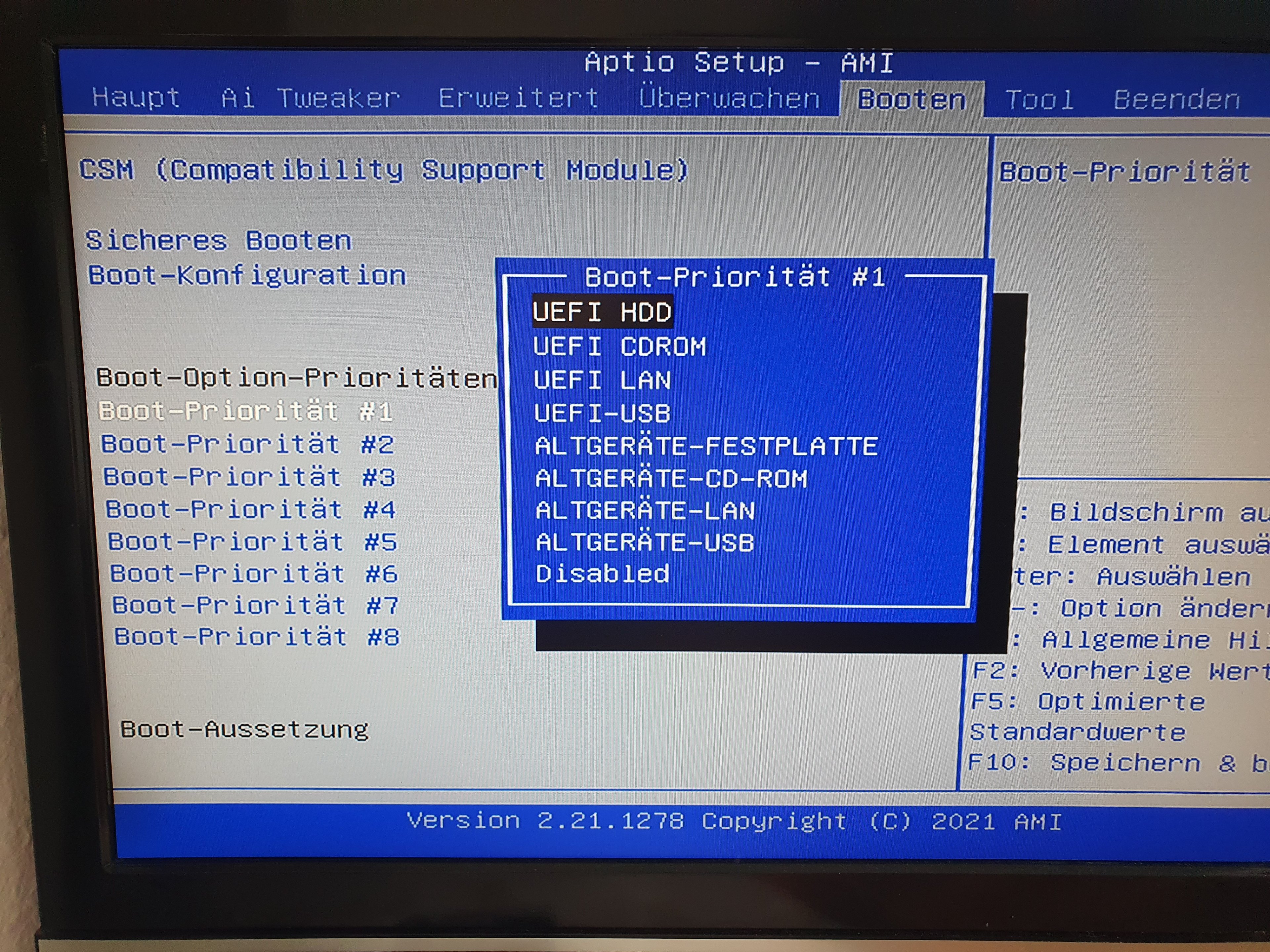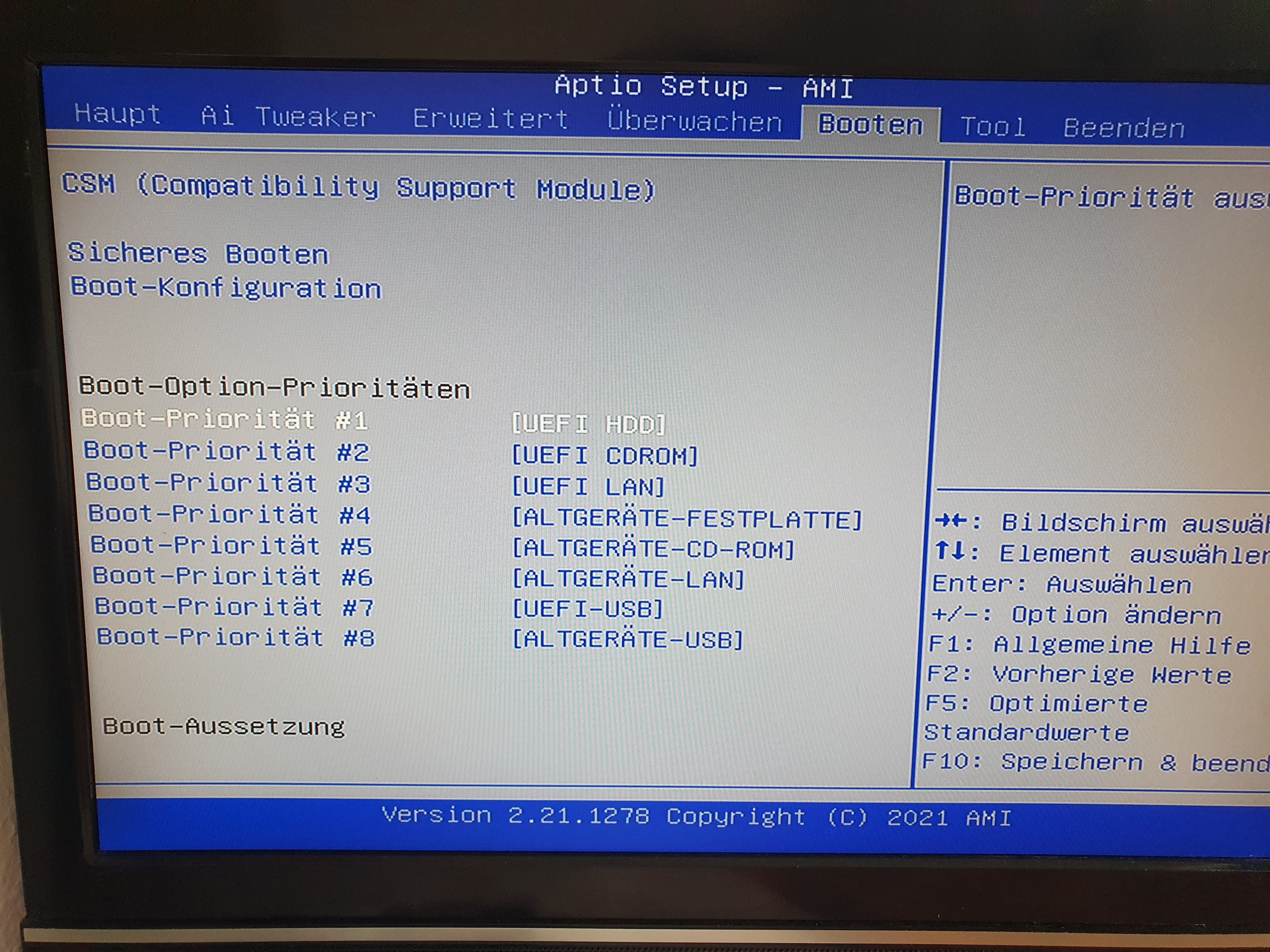 Ich habe den oben beschriebenen PC eben zusammengestellt und wollte den mal testen. Dafür habe ich meine zwei alten o.g Festplatten eingesteckt (neue ist unterwegs). Jedoch erkennt das Mainboard beide Festplatten nicht. Und im Bootmenü im BIOS werden diese auch nicht angezeigt (siehe Bilder). Auch wenn ich das Bootmenü starte werde ich zu den BIOS weitergeleitet und sehe keine auflistung der Festplatten. Windows ist auf beiden Festplatten drauf. Woran kann es liegen?