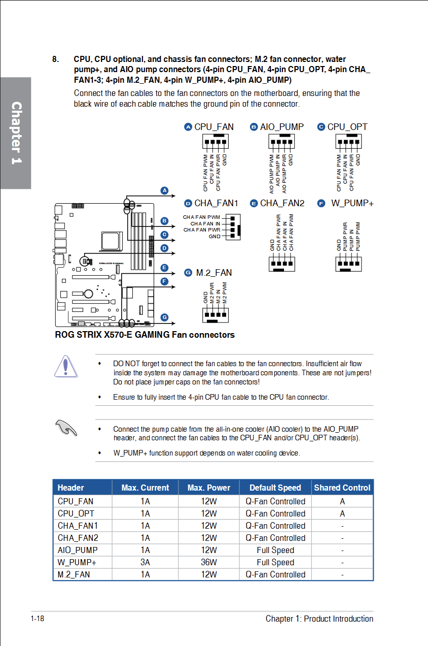 Wenn die Lüfter nicht drehen, wenn sie am CPU_FAN angeschlossen sind, stimmt etwas nicht. Zu beachten ist noch die Leistung pro Anschluss von 12W. Bei W_PUMP sind es 36W.