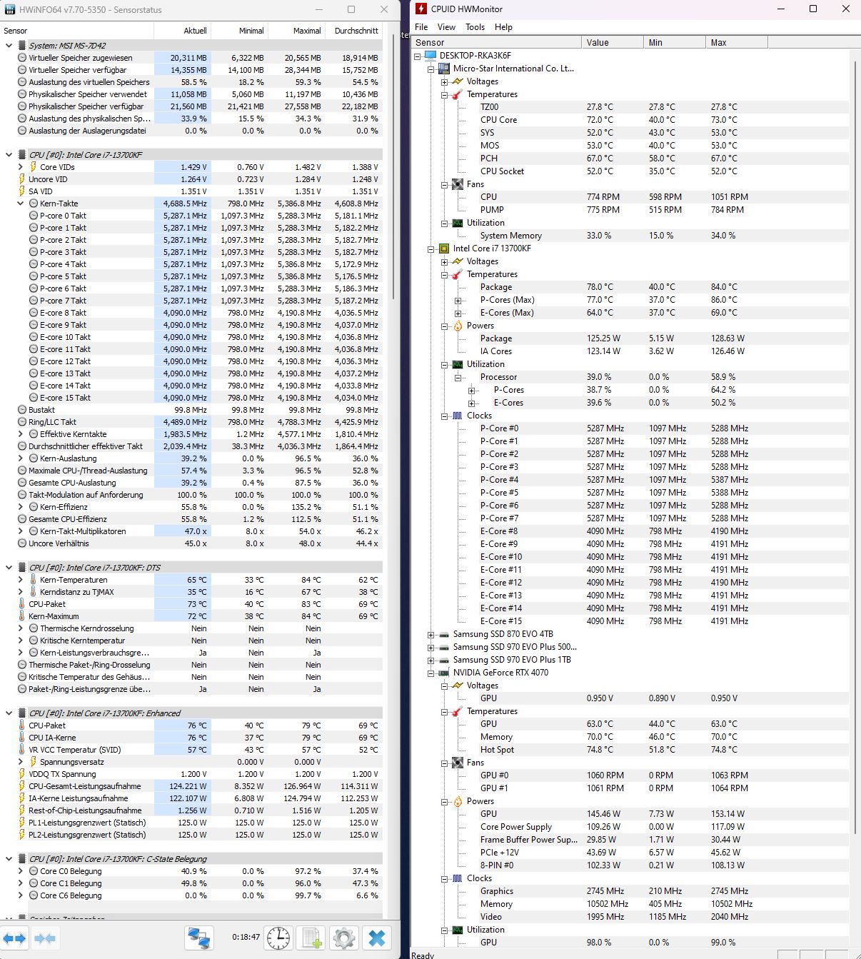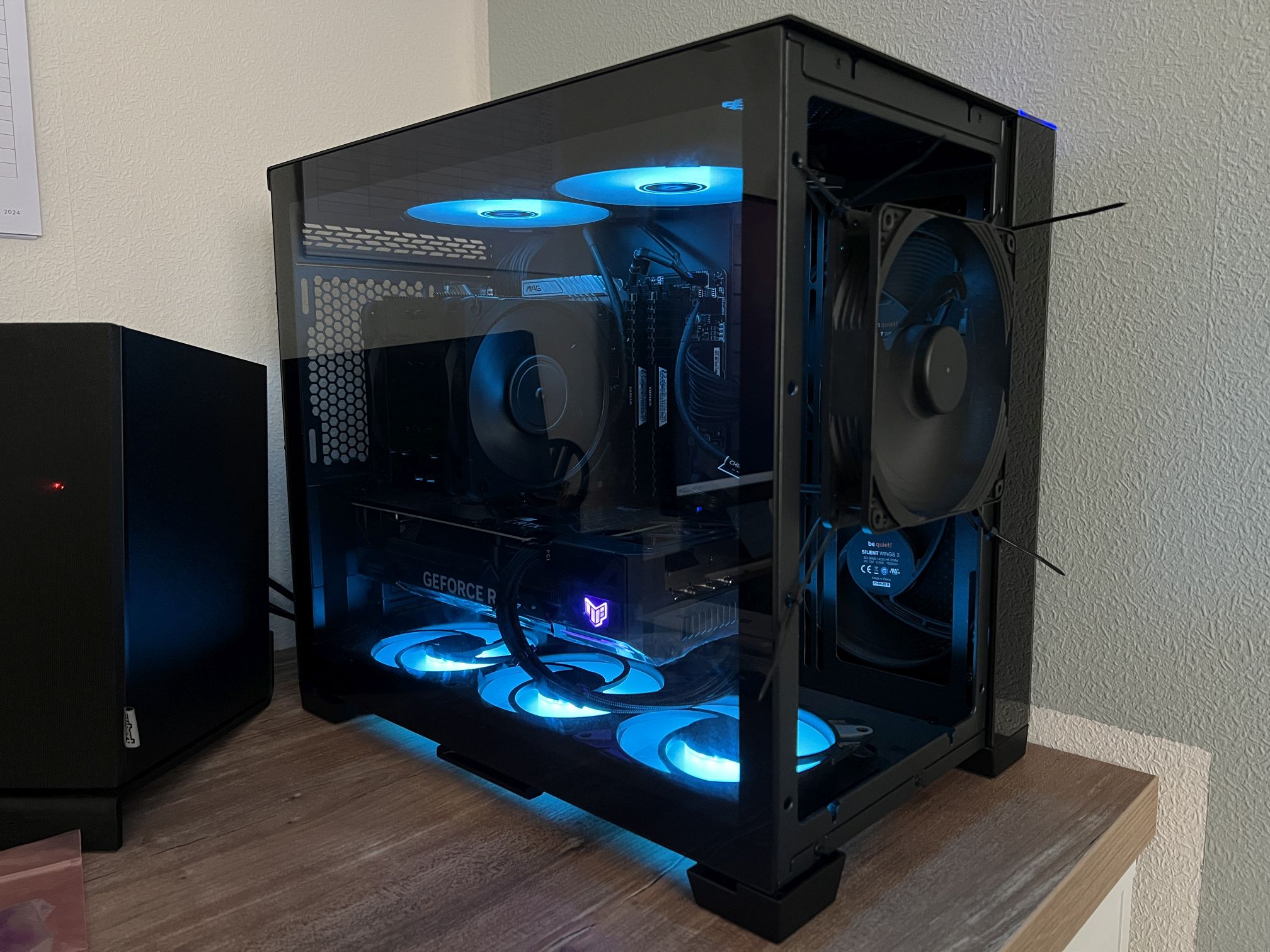 Bin ja gerade noch im O11 Mini, aber das Air Mini steht schon im Eck. Hab mir Ghettomäßig einen 140er in die Front gehängt und Cyberpunk 15 Minuten bei 125W laufen lassen. Alle Lüfter laufen auf 600rpm, da die noch von der Aquasuite gesteuert werden, CPU und Front (Pump) sieht man ja auf dem Bild.
