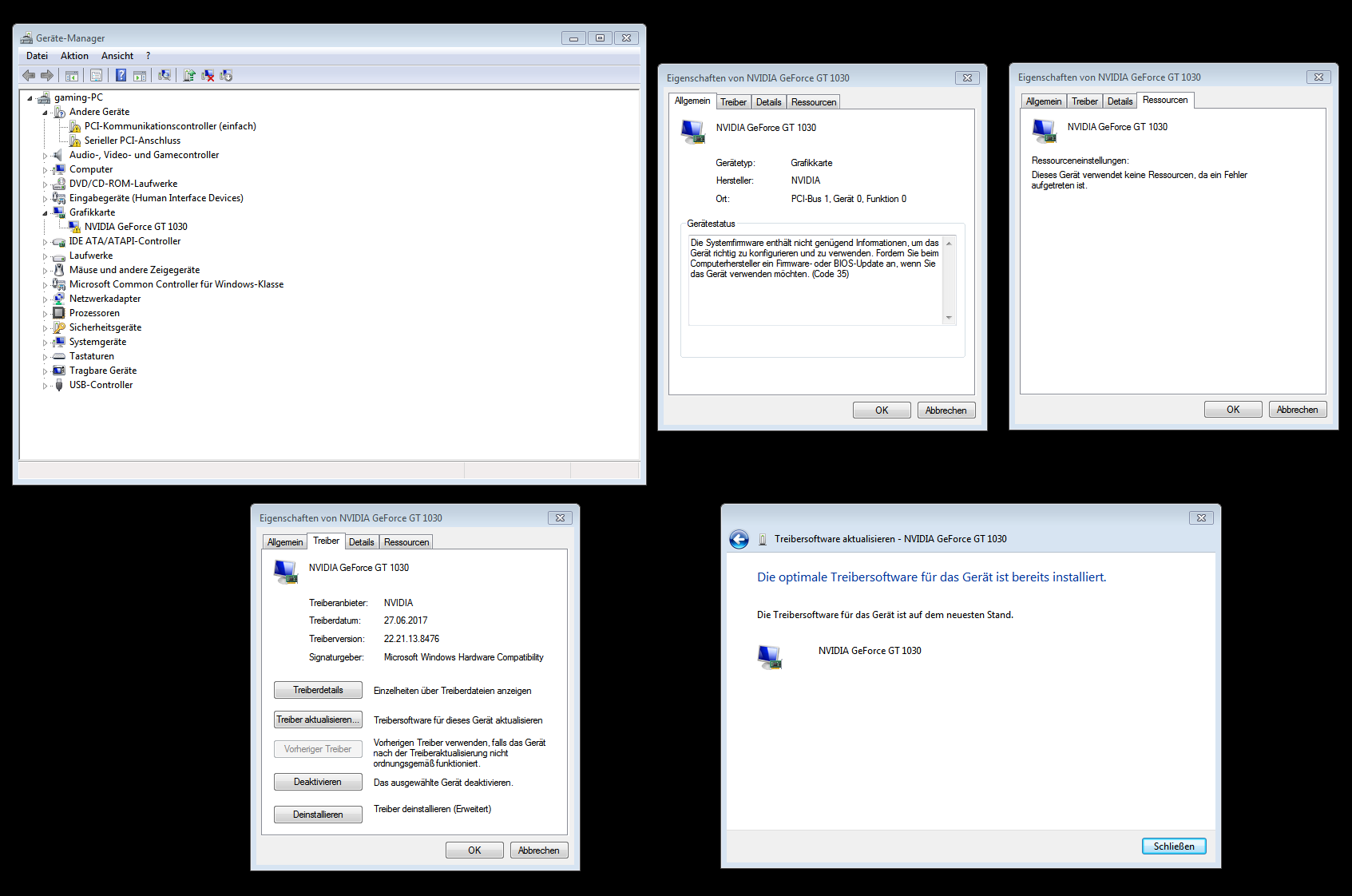 "Die Systemfirmware enthält nicht genügend Informationen, um das Gerät richtig zu konfigurieren und zu verwenden. Fordern Sie beim Computerhersteller ein Firmware- oder BIOS-Update an, wenn Sie das Gerät verwenden möchten. (Code 35)"