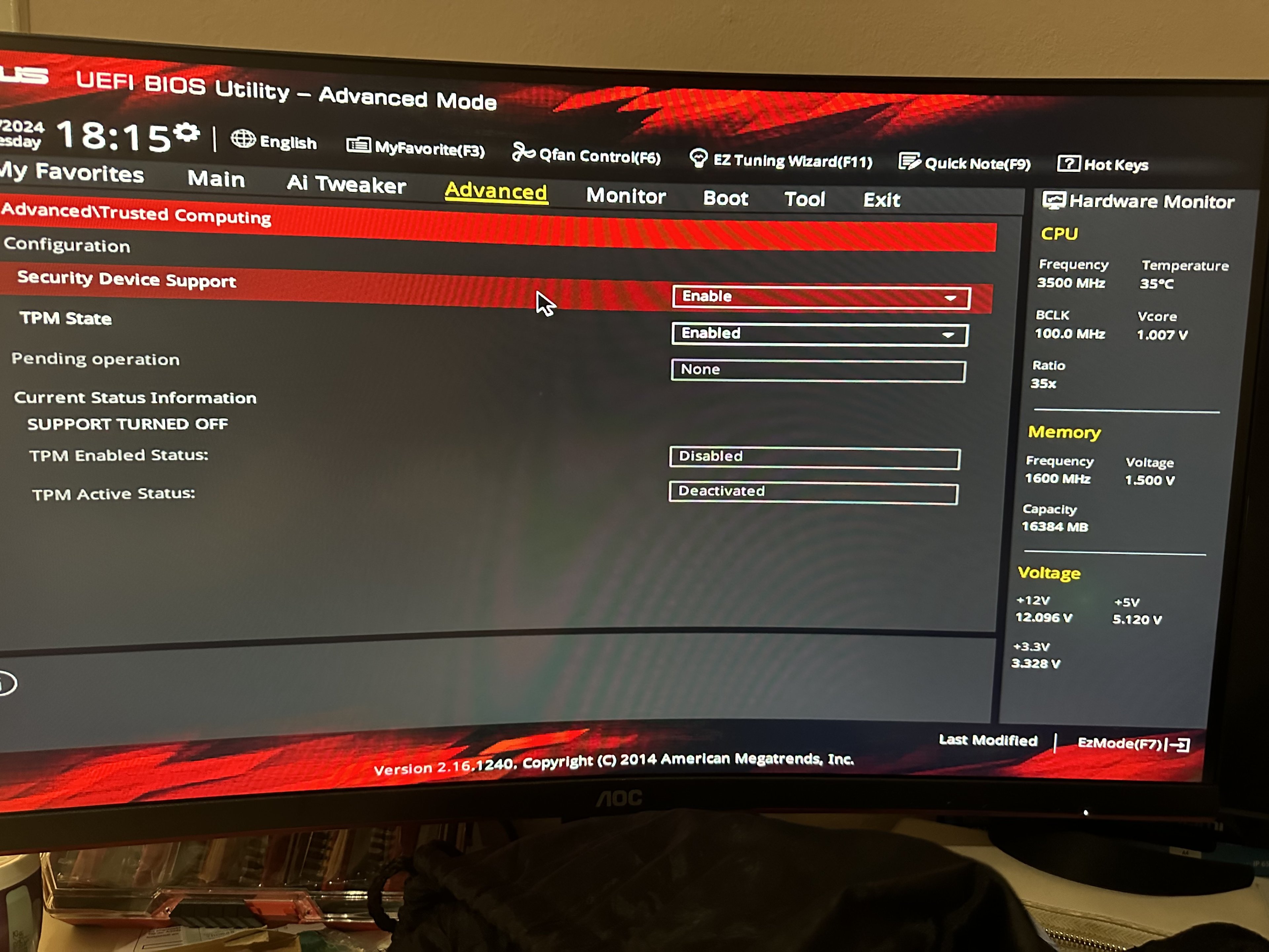 Wir kriegen nun Trusted Computing angezeigt seit dem das Modul angesteckt ist, jedoch wenn wir "Security Device Support" und "TPM STATE" auf Enabled setzten, ist "TPM Enabled Status" und "TPM Active Status" verblichen (ausgegraut).