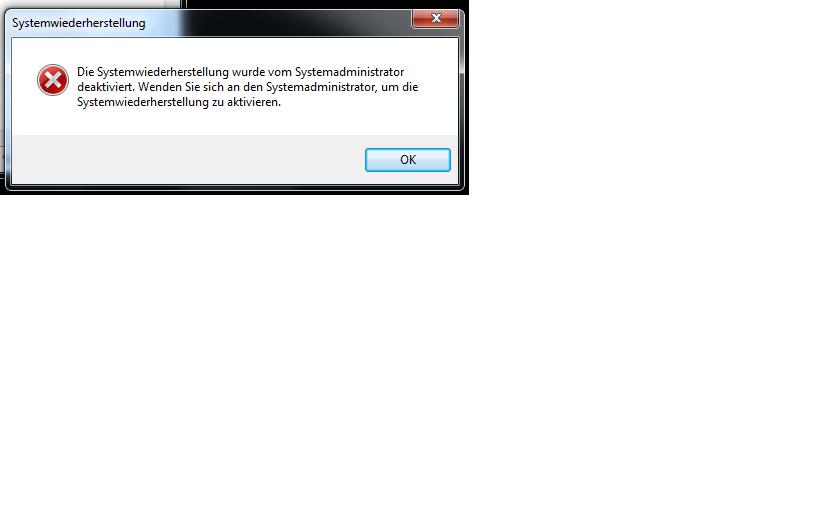Komme an, mache PC an, lasse ihn so circa 5 Minuten laufen, dann den Vorschlag gefunden, mal Systemwiederherstellung auszuprobieren. Wollte ich gleich ausprobieren, doch nichts ist. Er läd zwar kurz dann ist jedoch Ende. Und das war dann bei allen Programmen so. Ich konnte den PC nicht mal mehr herunter fahren, er hat einfach gar nichts mehr gemacht, außer das Startmenü zu öffnen. Neu gestartet, dann erneuter Versuch der Systemwiederherstellung, doch dann kam folgender Fehler: (siehe 2. Anhang). Jedoch ist er Administrator. Wie kann ich das lösen?