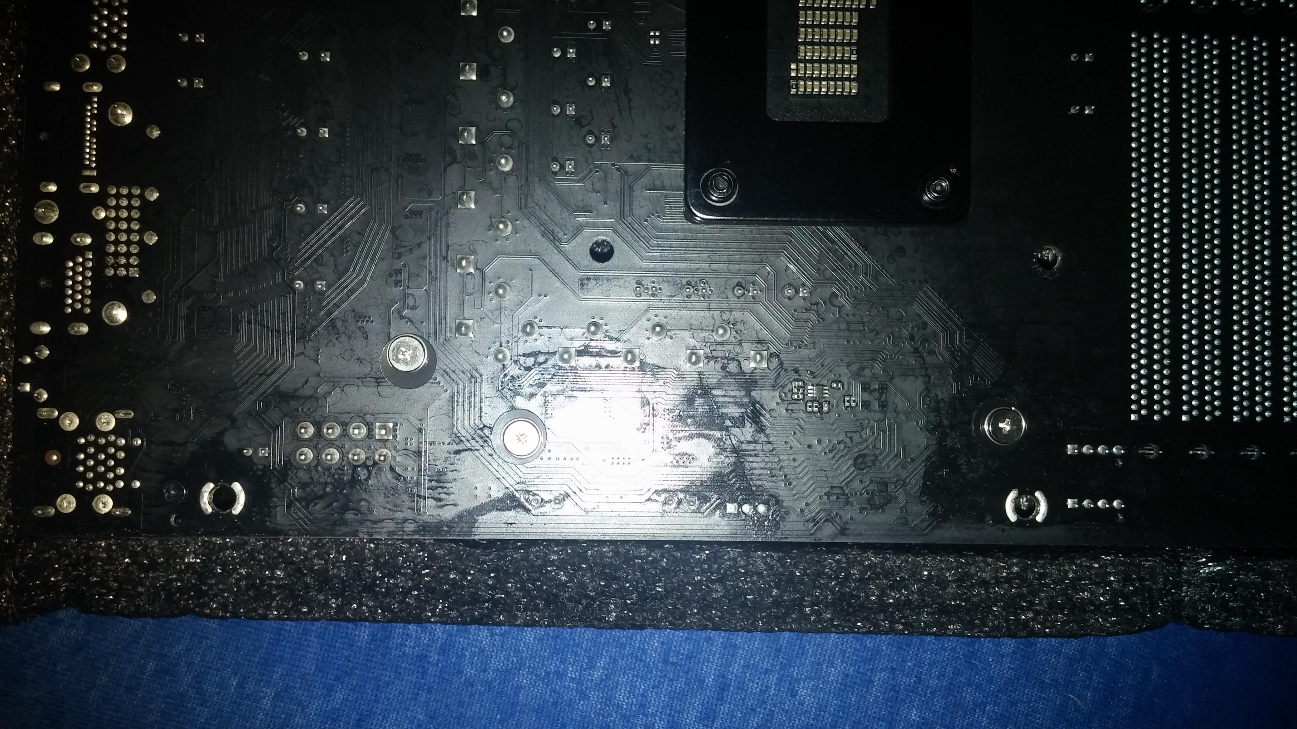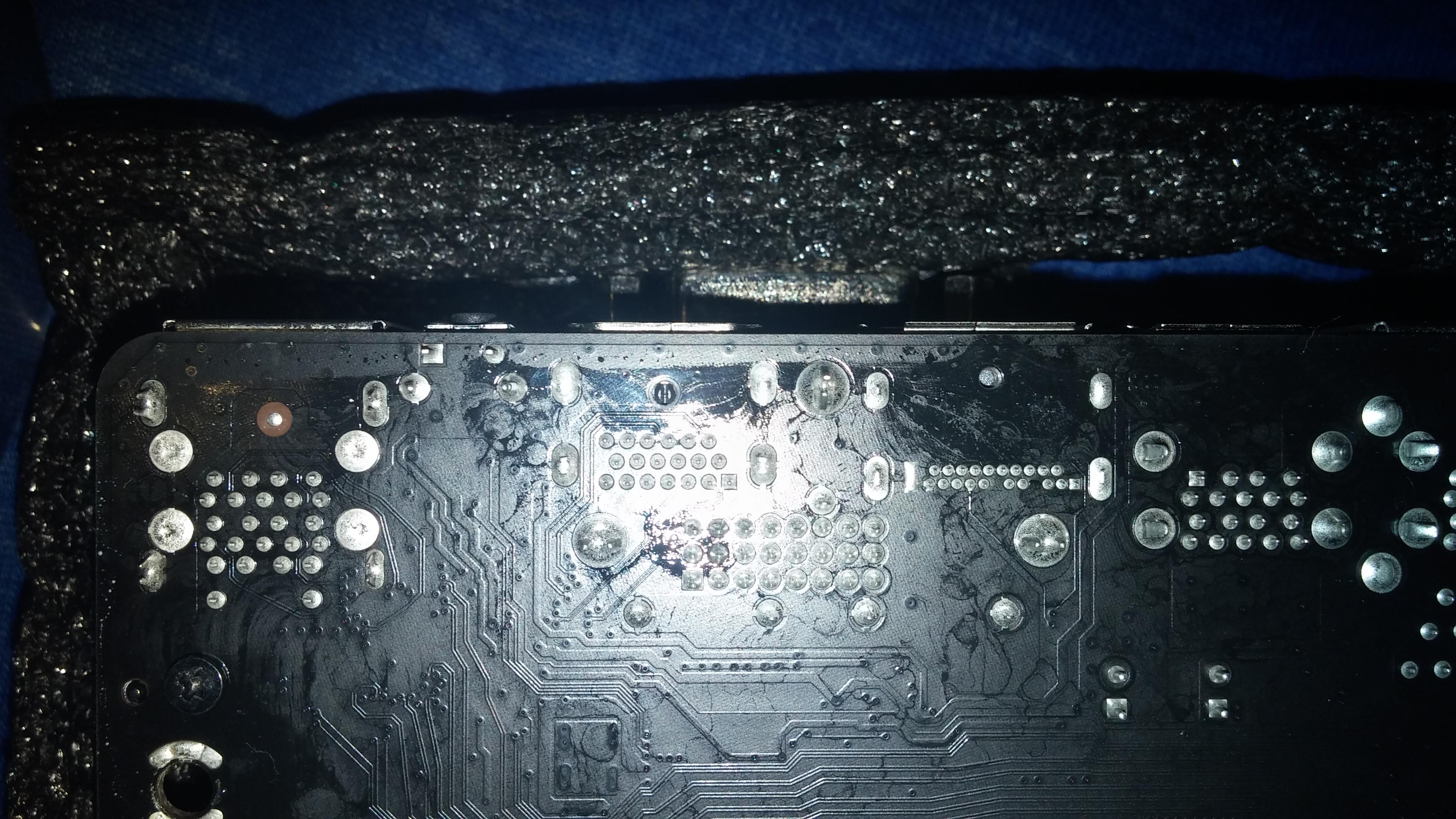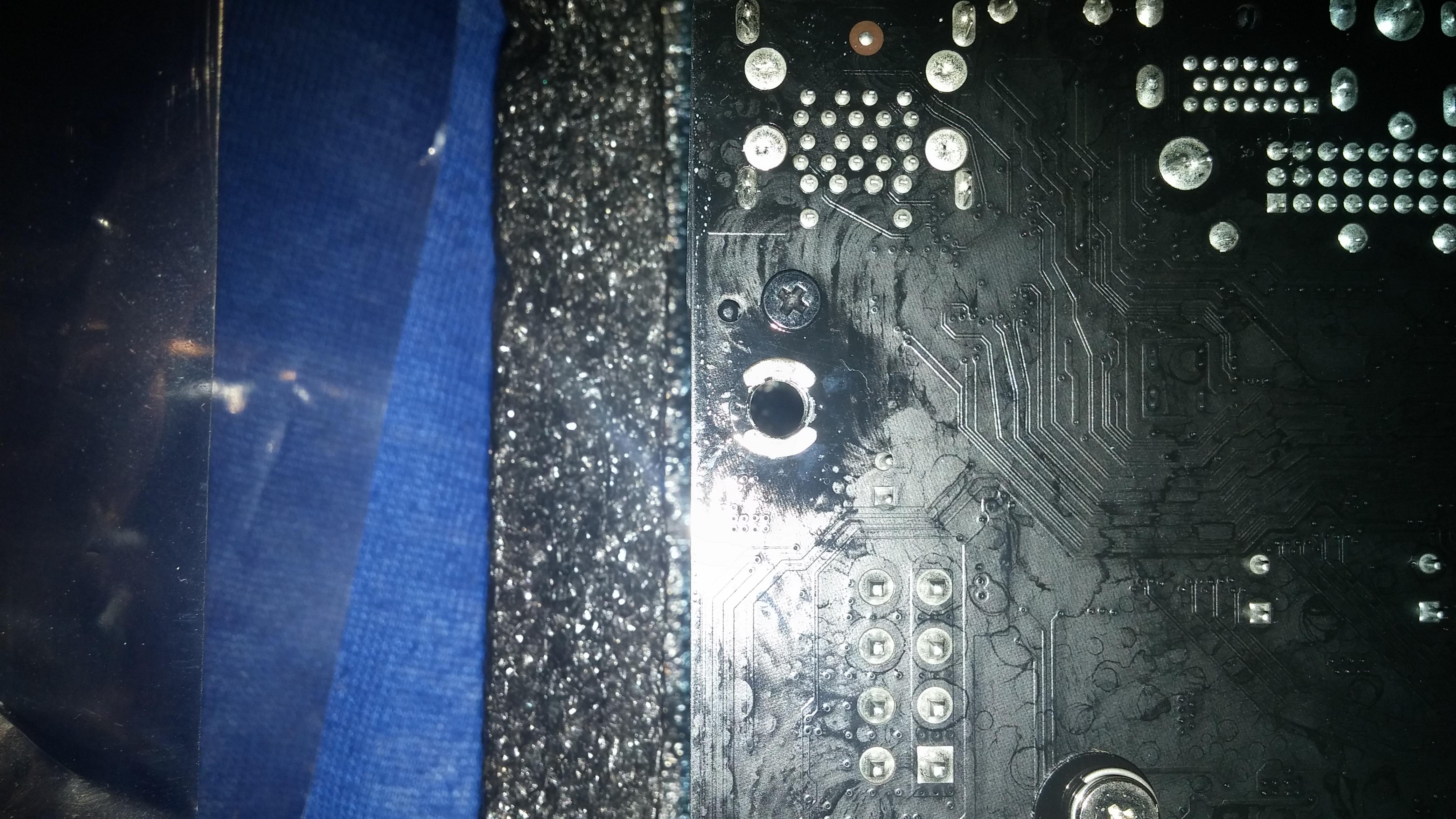 Hab das ding mal umgedreht und was ist zu sehen: Um die ATX befestigungslöcher ist irgenteine art klebrige Flüssigkeit ''verlaufen''.