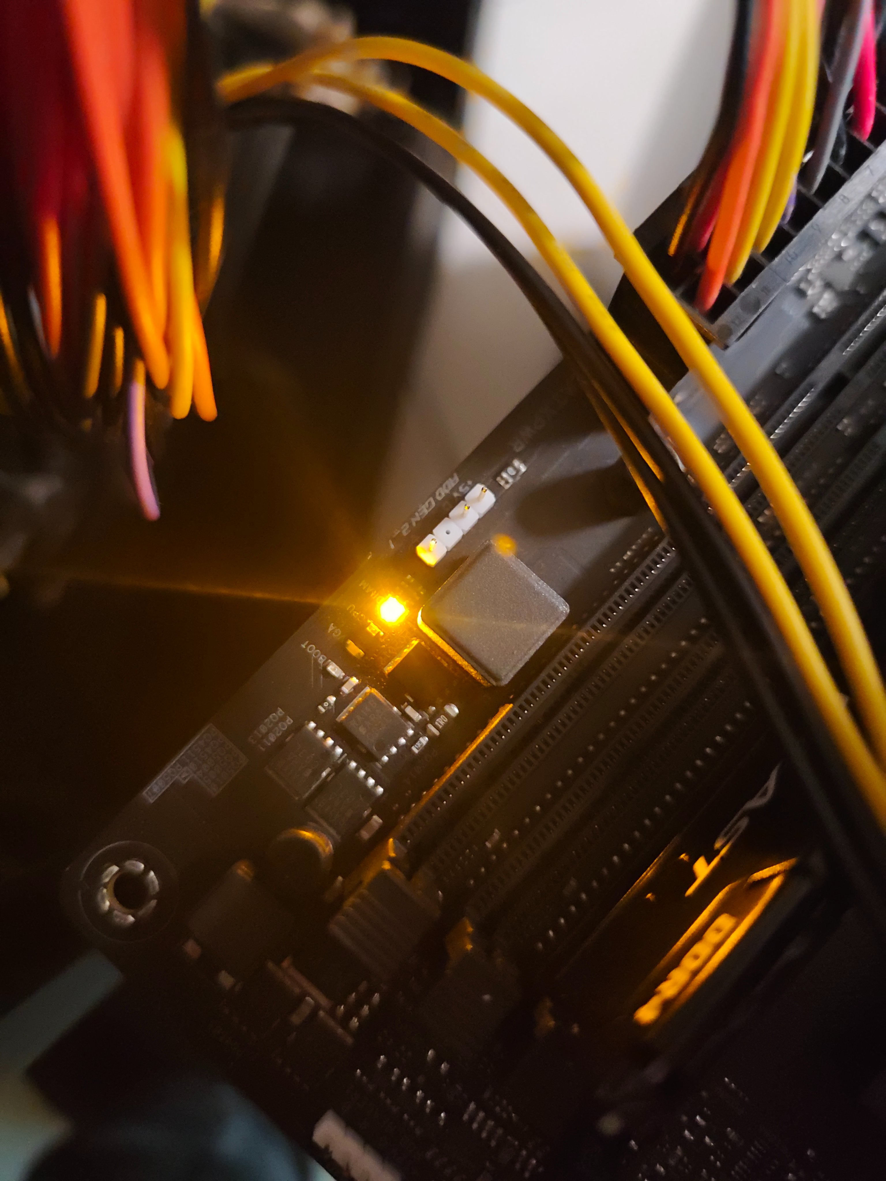 Währenddessen blinken die LEDs am Mainboard abwechselnd: DRAM CPU VGA BOOT.
