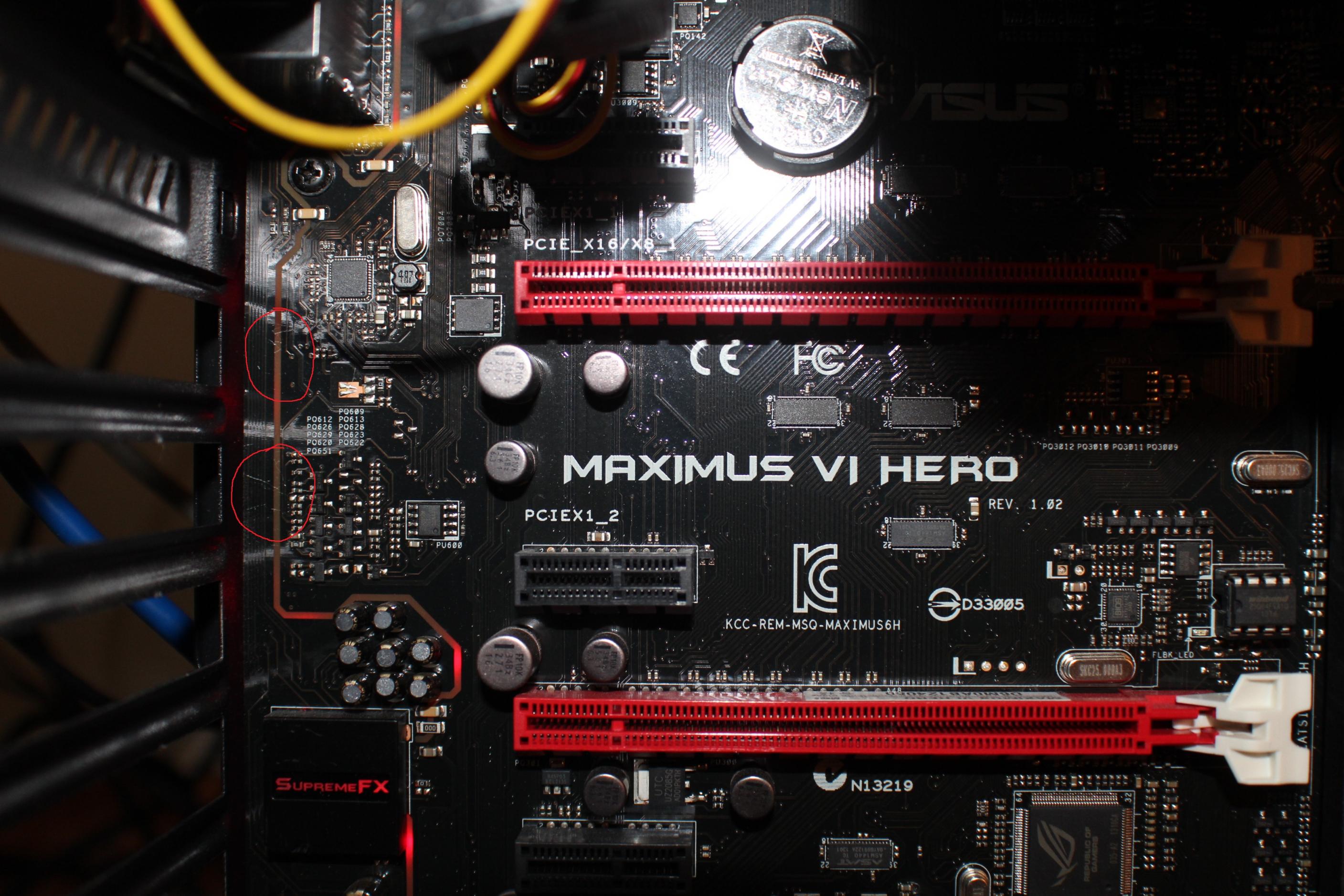 Habe beim rausbiegen der Bleche um an den zweiten PCI-e Anschluss zu kommen mein Mainboard leicht Zerkratzt, direkt über ein paar Leiterbahnen :-(