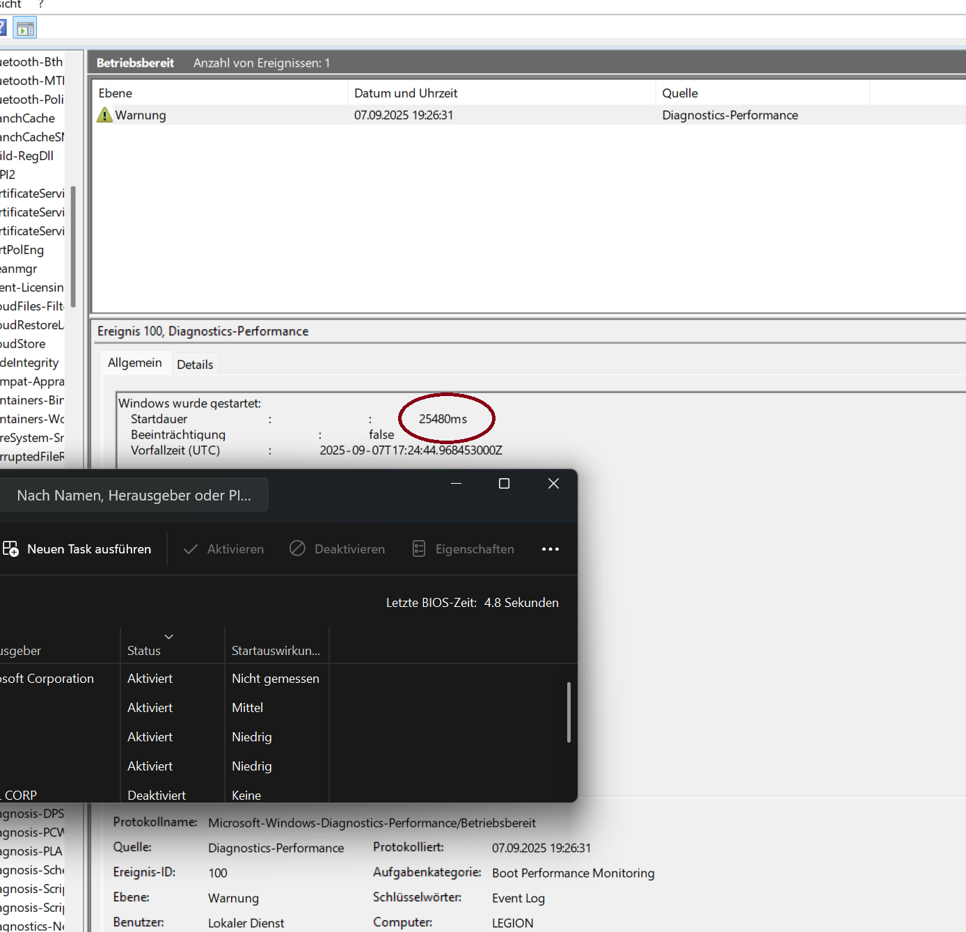 Du weißt aber schon, dass dieses Event die Windows Startzeit vom Bootmanager bis zum Desktop protokolliert, die hier 25,5 Sek beträgt? Und genau darum gehts gar nicht, sondern die Zeit vom Einschalten des Rechners, bis der Bootmanager den Systemstart einleitet.