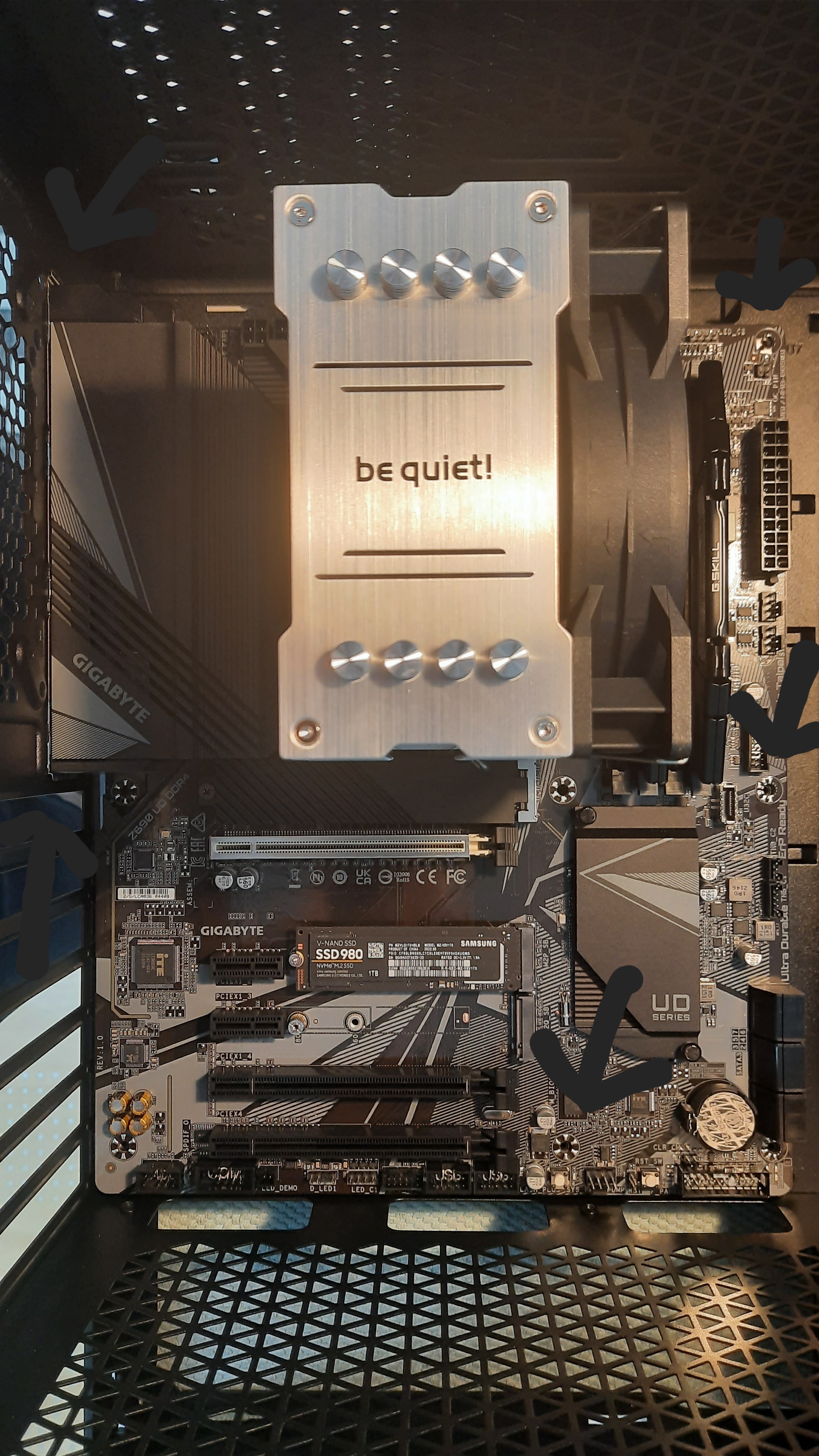 ich versuche gerade, das Gigabyte z690 ud ddr4 Mainboard in das bequiet! Pure Base 500 Gehäuse einzubauen.