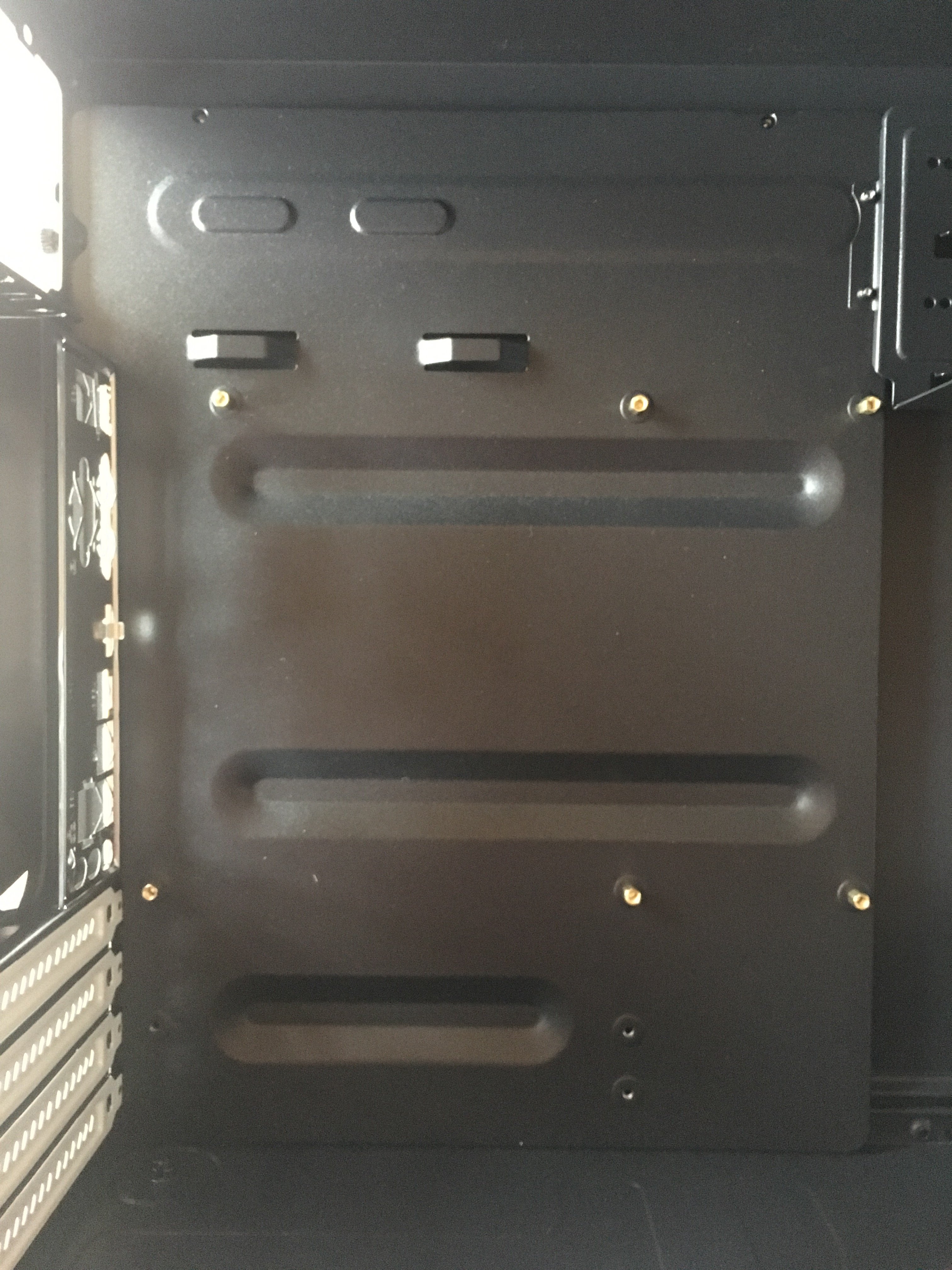 Ich bin jetzt an dem Punkt, wo ich das Mainboard ins Gehäuse einbauen möchte. Abstandshalter sind drin und die I/O Blende ebenfalls. Wenn ich das Mainboard nun vorsichtig einsetze, geht es an der linken Seite nicht richtig runter, weil da das schwarze Ding vom Gehäuse im Weg ist (siehe rote Markierung im Bild).