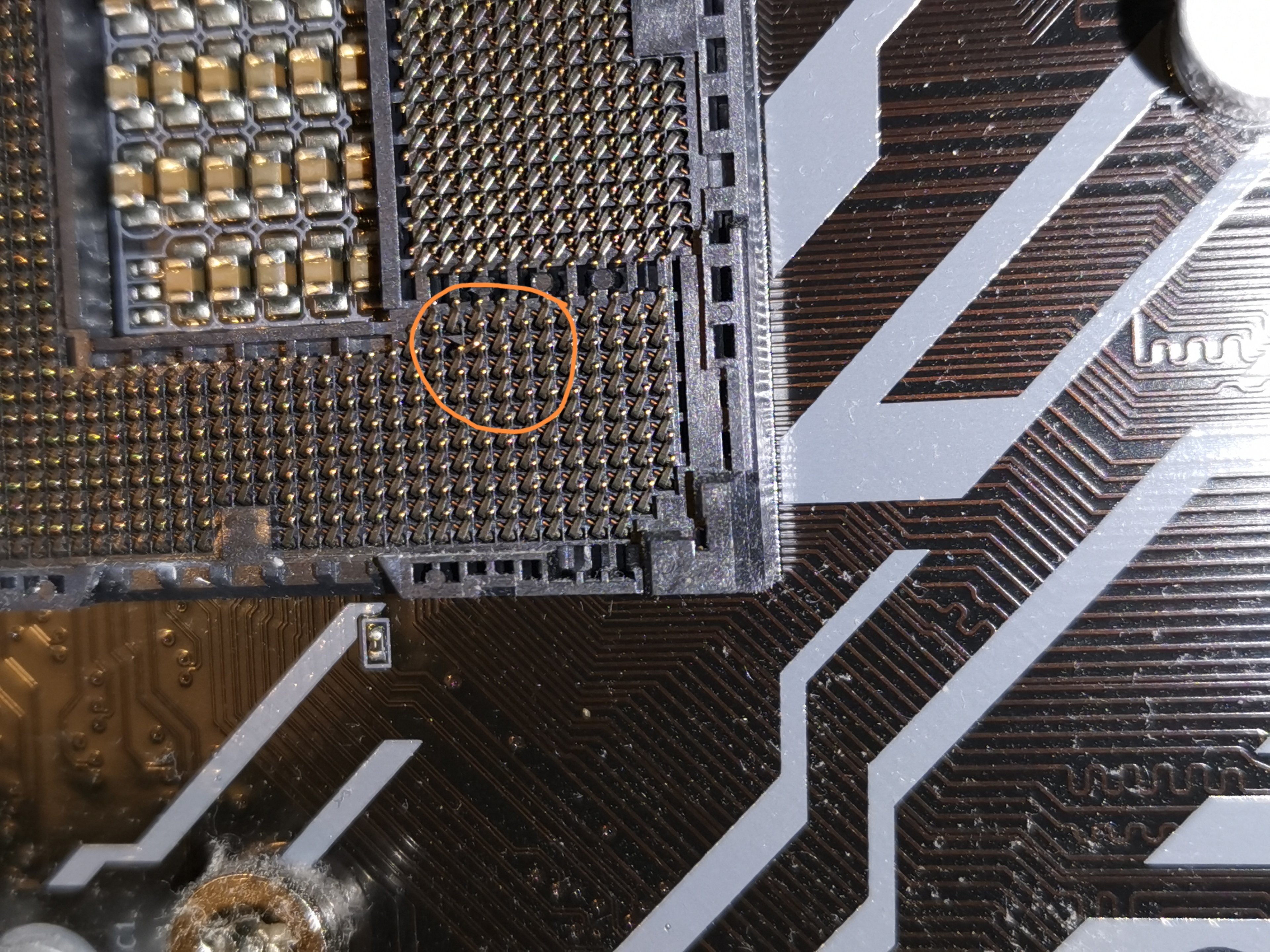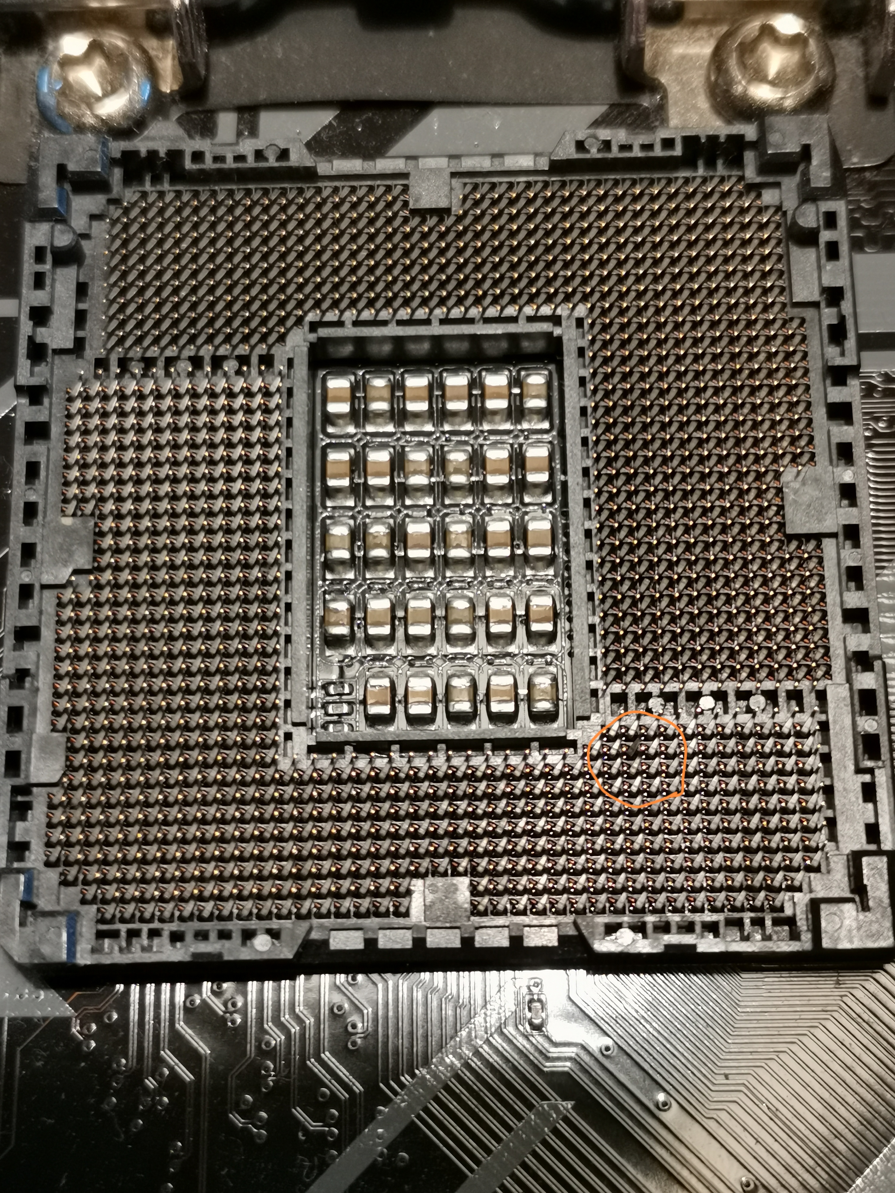 Habe am WE mein System vom Staub befreit. Da ich den RAM (2x8GB Crucial Ballistix Sport LT 2666 cl16) mit dem Board nie im Dual-Channel betreiben konnte (habe das Board und Ram damals ganz billig von jemandem gekauft, der es nicht zum laufen gebracht hatte), habe ich auch einen Blick unter die CPU geworfen. Tatsächlich fand ich einen verbogenen Pin. Da ich recht perfektionistisch bin, entschied ich mich also den Pin gerade zu biegen. Jetzt ist der Pin tatsächlich wieder sehr passend. Nur aus bestimmten Winkeln kann man noch sehen, dass der Pin etwas anders reflektiert und minimal schief schaut er je nach Betrachtungswinkel auch noch aus (siehe unbedingt die Bilder im Anhang). hab dann kurz ein Setup zusammengesteckt um zu schauen ob alles funktioniert. Dann kam die Ernüchterung. Lüfter und Beleuchtung gehen an, der beeper piept 5x kurz, dann bleibt das System an bis es manuell abgeschalten wird. Laut Google-Suche bedeutet 5x kurz bei Gigabyte CPU-Error. Manche berichten auch von Problemen mit der Grafikkarte bei diesem Code, was sich bei mir allerdings ausschließen lässt, da sich mein System auch ohne GPU gleich verhält.