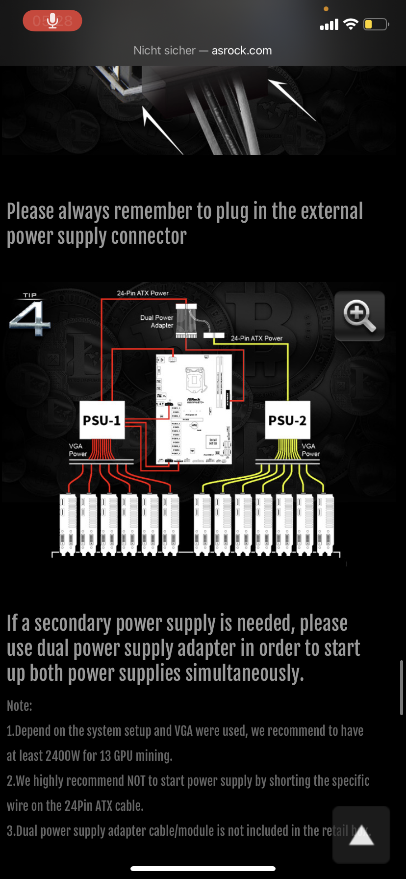 Normalerweise sollten die beiden Netzteile getrennt bleiben, wenn das 2. Netzteil nur an den GPUs und deren Riser hängen, da diese den Strom direkt aus dem 2. Netzteil holen anstatt aus dem Slot.