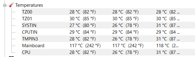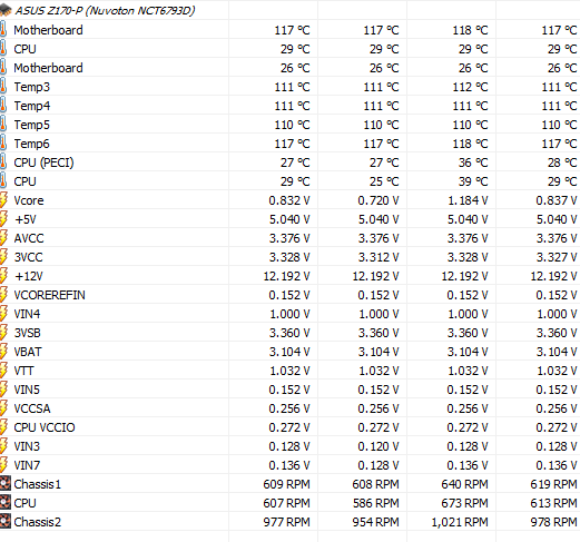 Das System läuft stabil wie immer. Dennoch verunsichern mich diese Messungen. Kann doch nicht sein das alle Temp Sensoren im Eimer sind? Das Board ist aktuell also kommt mir das schon komisch vor das sowohl hwinfo als auch hwmonitor solche fehlerhaften Temperaturen anzeigen. Was meint ihr ist das normal oder sollte ich mal das Board bei Asus einschicken?
