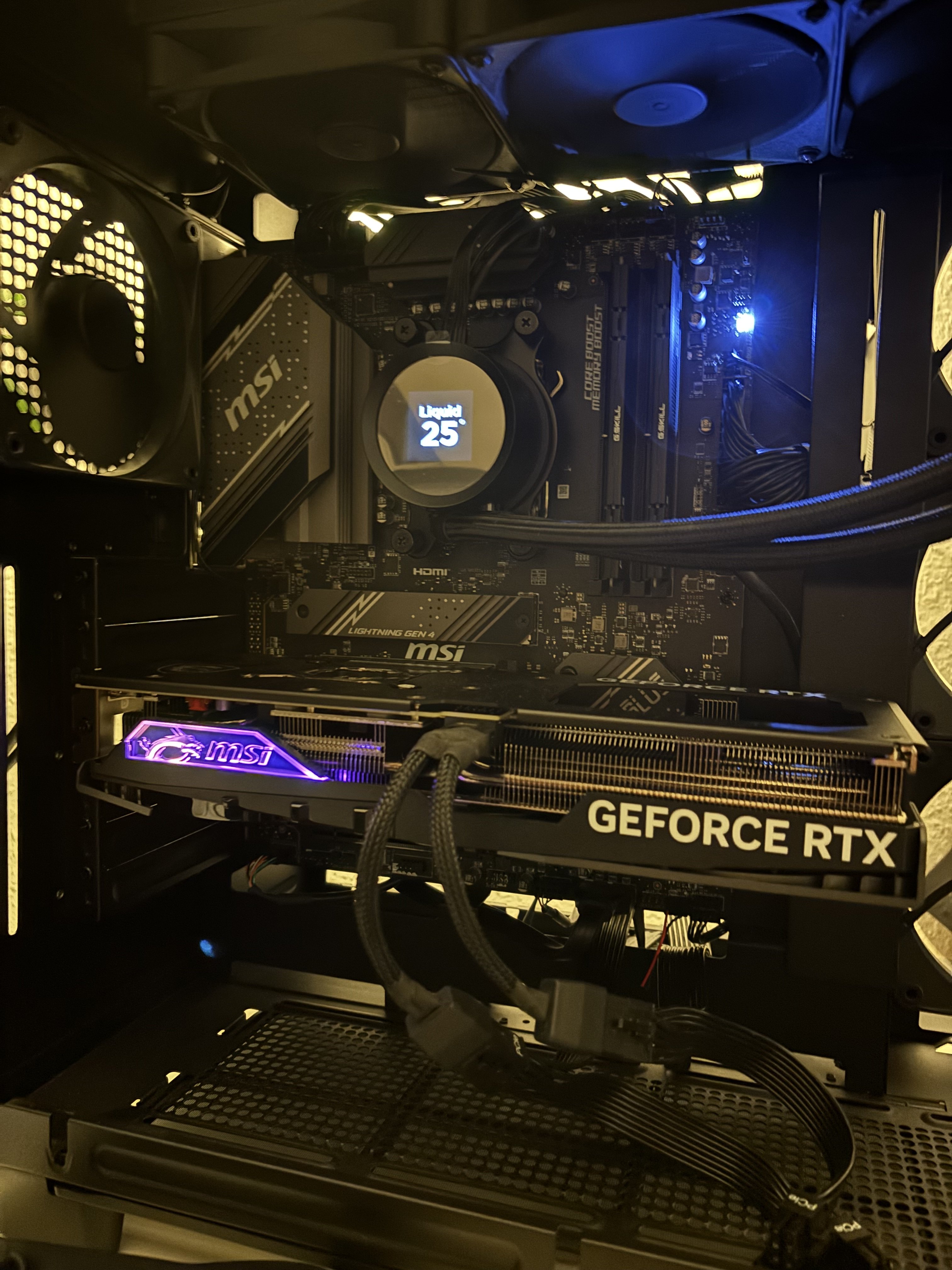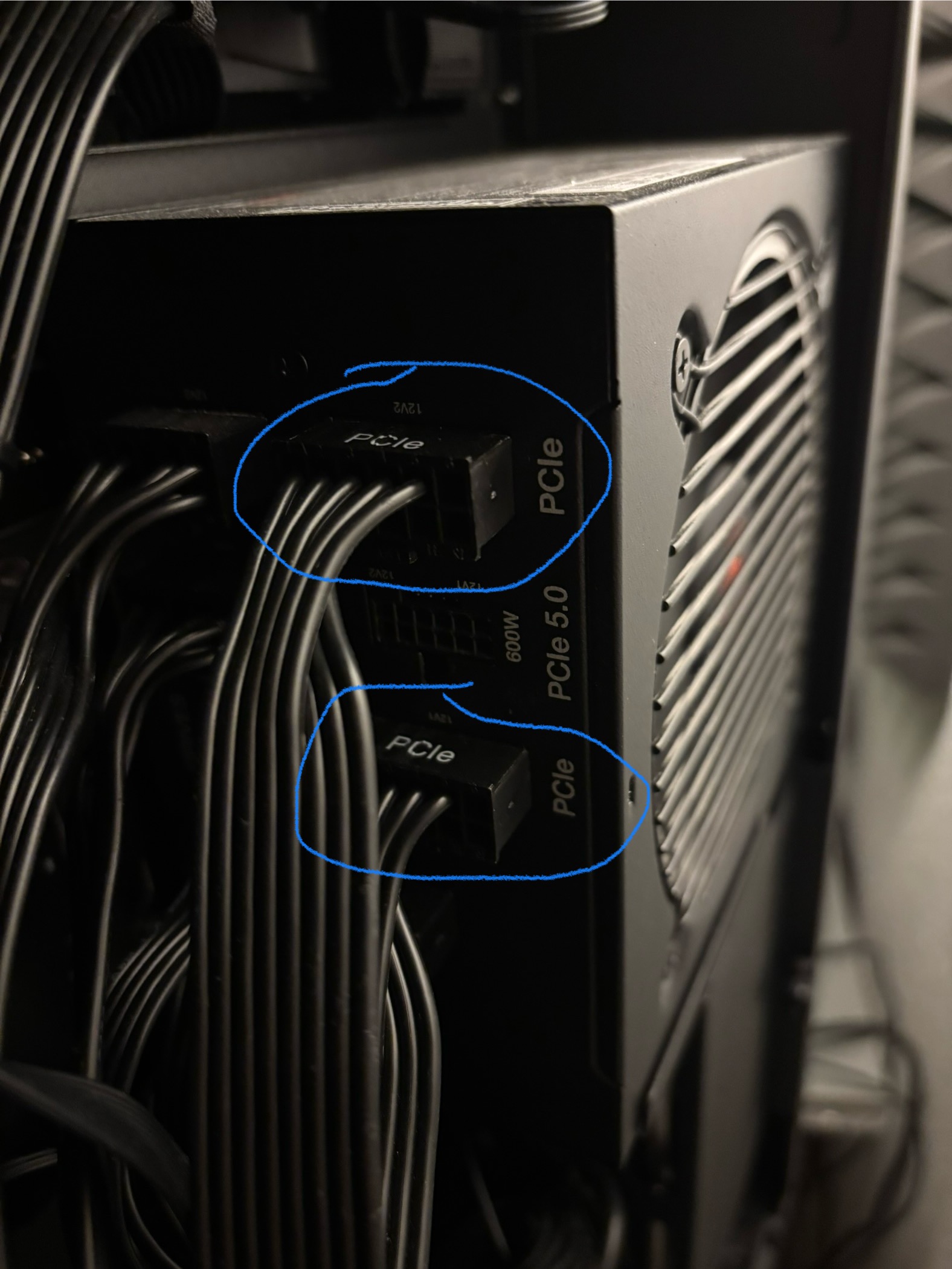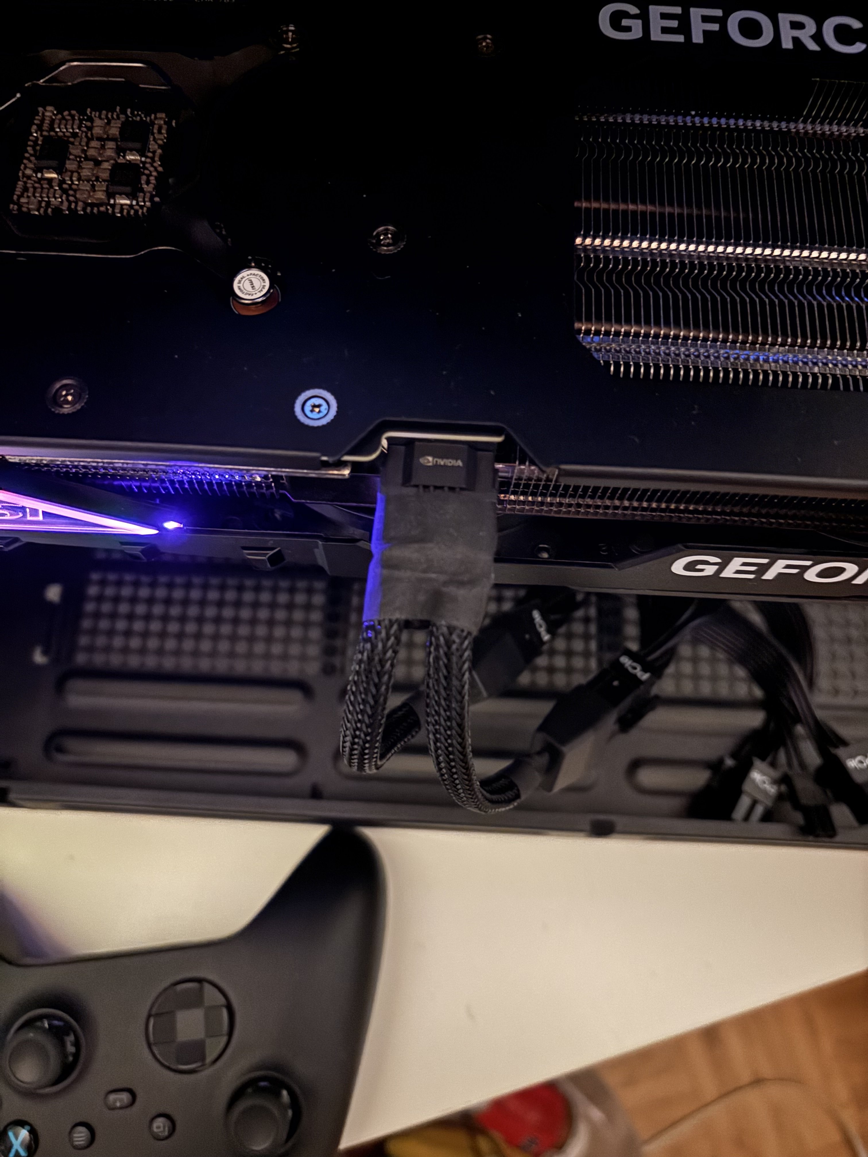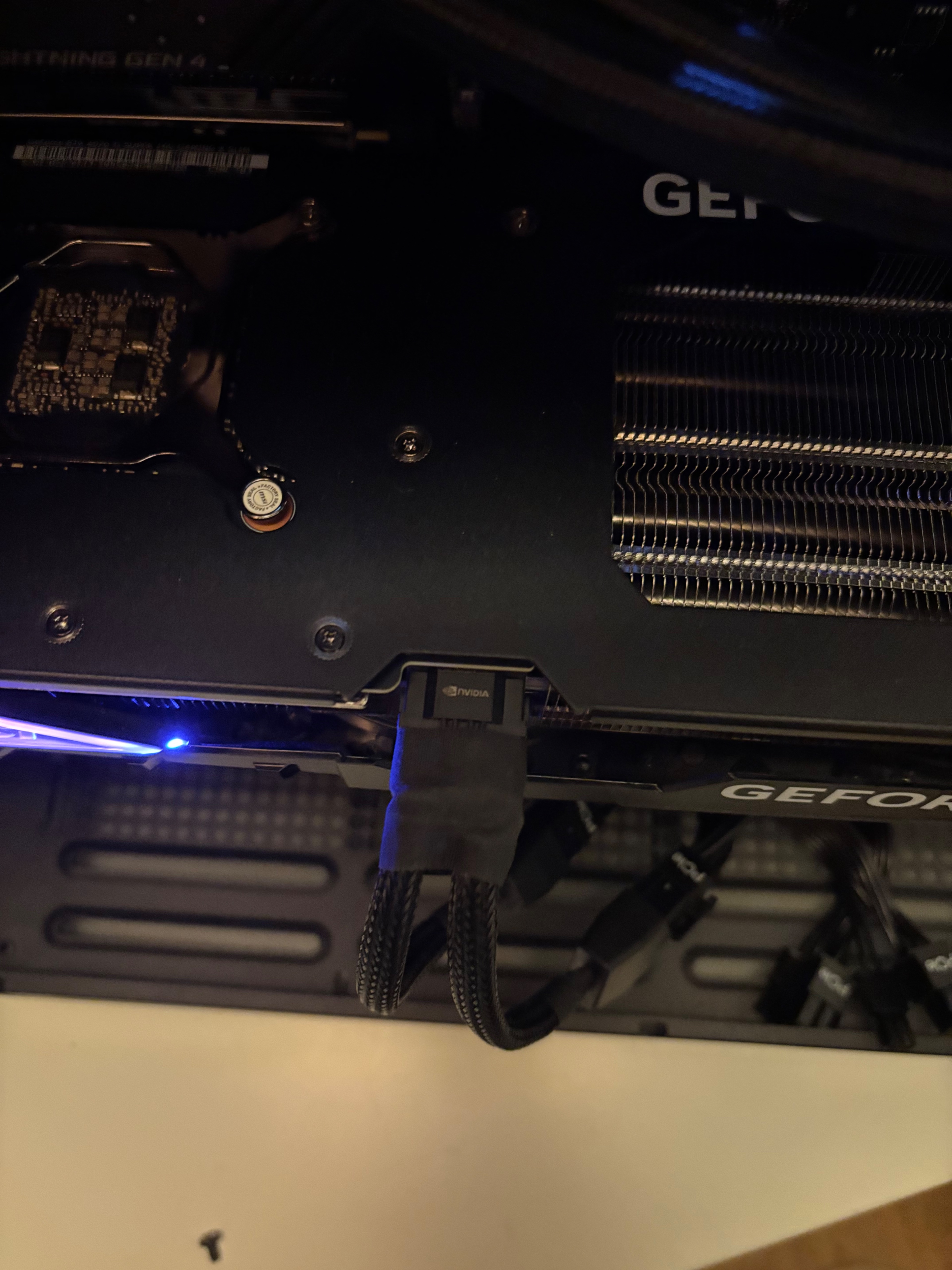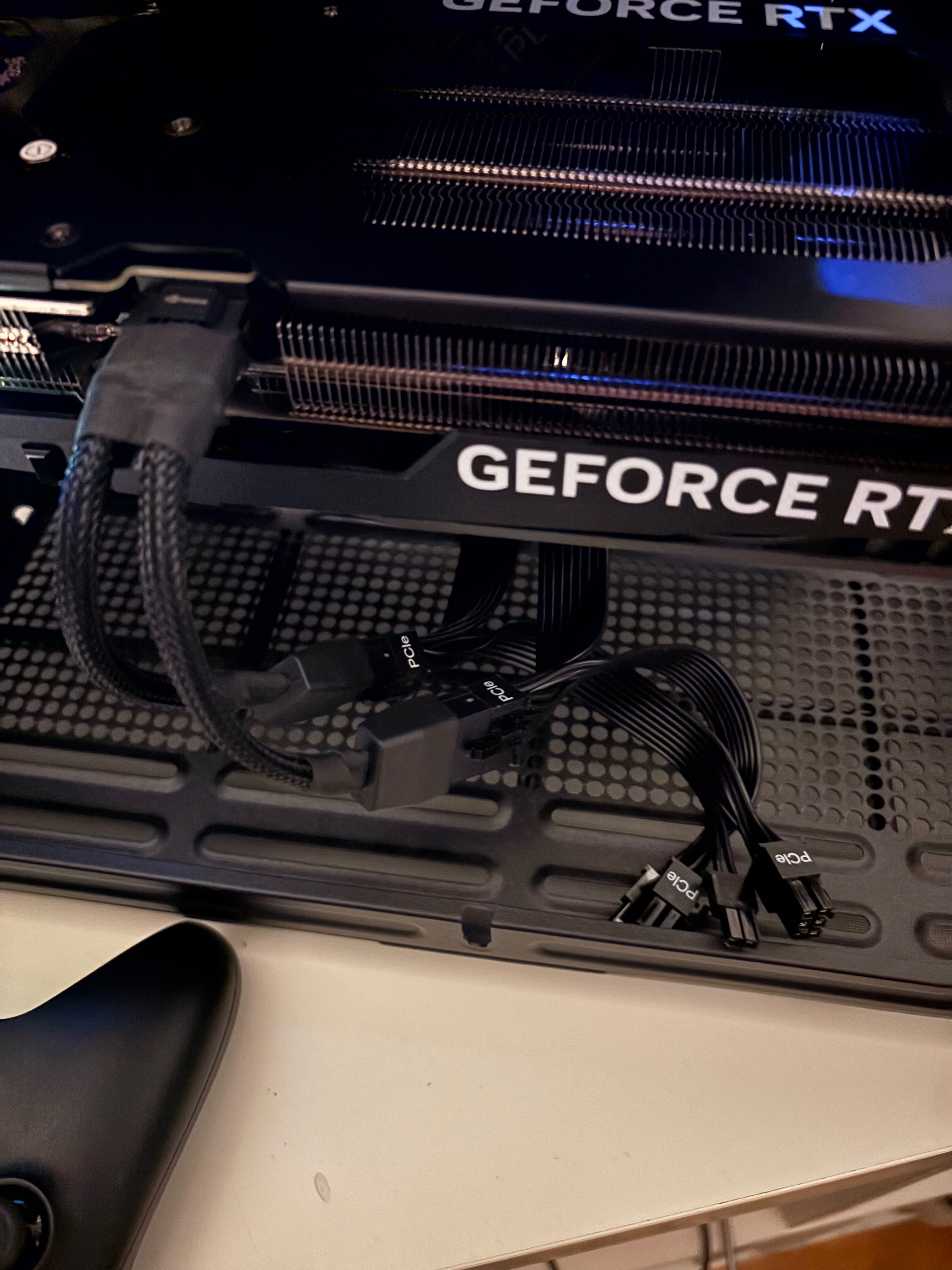 Beim ersten Starten des PCs leuchtete die VGA-Lampe am Mainboard weiß, und ich erhielt kein Bild. Nach mehreren Neuanschlüssen und dem Einstecken meiner alten Grafikkarte funktionierte es, und ich konnte den PC normal benutzen. Ich hatte mir im Nachhinein keine Sorgen mehr gemacht, da ich etwa einen Monat lang keine Auffälligkeiten mehr hatte. Ganz selten trat das Problem danach noch einmal auf, jedoch habe ich es jedes Mal wieder hinbekommen. Jetzt möchte ich doch mal um Hilfe bitten, da es seit zwei Tagen in Folge auftritt. Beim Einschalten des PCs erhalte ich kein Bild, und die VGA-Lampe leuchtet dauerhaft weiß. Bisher habe ich die Grafikkarte neu eingesetzt, sie gereinigt, den RAM neu eingesetzt, Kabel ausgetauscht und Updates überprüft. Ich bin mir auch bei dem Kabel nicht ganz sicher, da die 4070 Super TI ja den neuen PCIe 5.0 unterstützt. Da habe ich das beim Netzteil beigelegte Einzelkabel ausprobiert, was aber nicht funktioniert hat. Aktuell ist die Grafikkarte mit einem Adapter angeschlossen, der bei meiner Grafikkarte beigelegt war, bei dem zwei PCIe-Kabel in den PCIe-Adapter übergehen (siehe Bild).