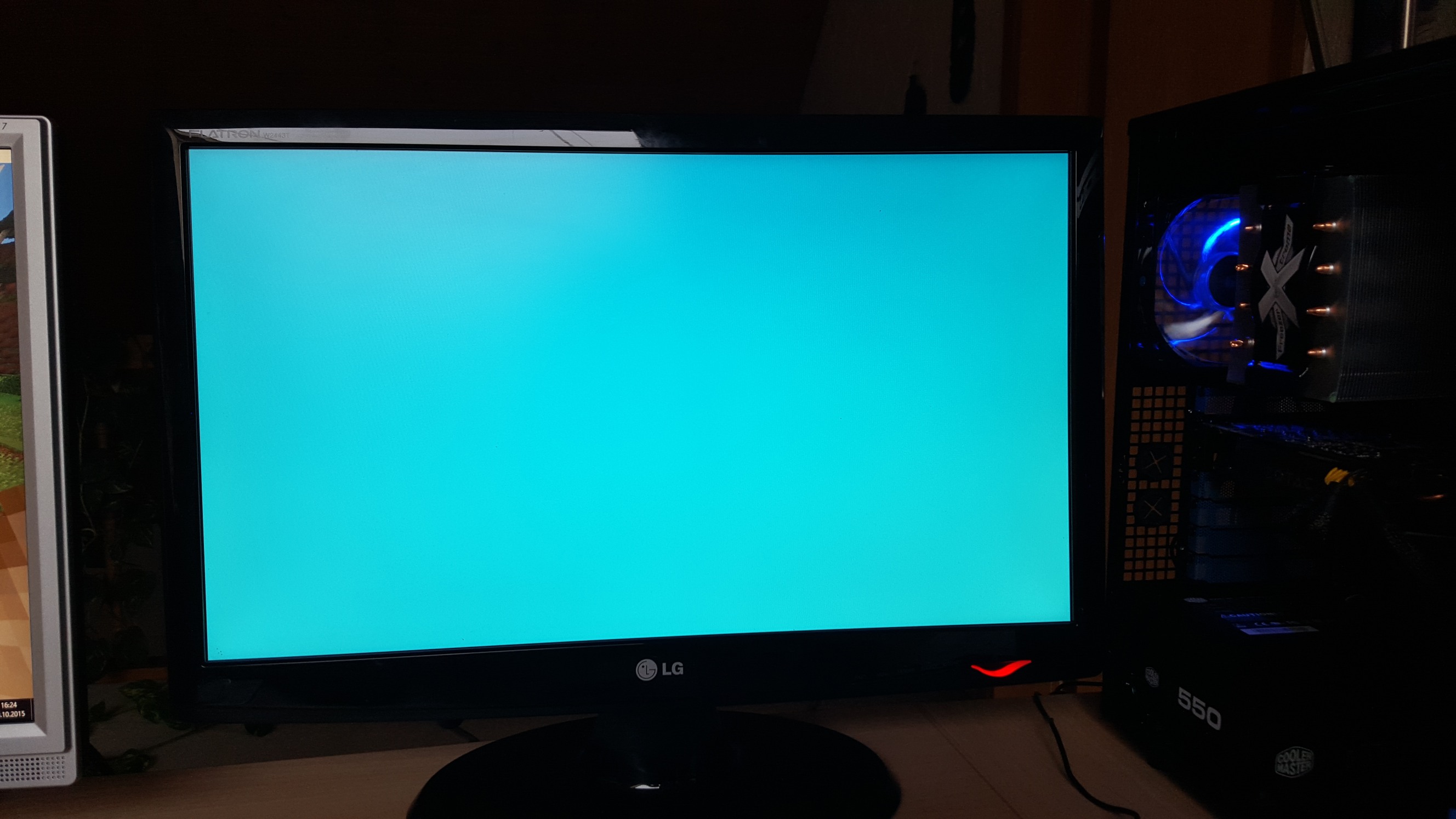 Jetzt kommt es zunächst zu dem beigefügten seltsamen Bild, dann wird der Bildschirm nur türkis.