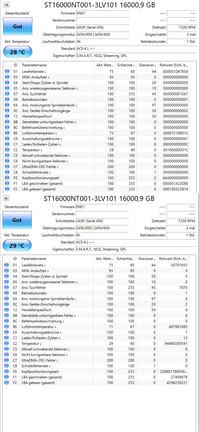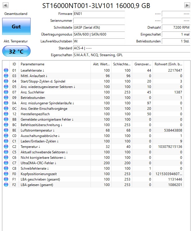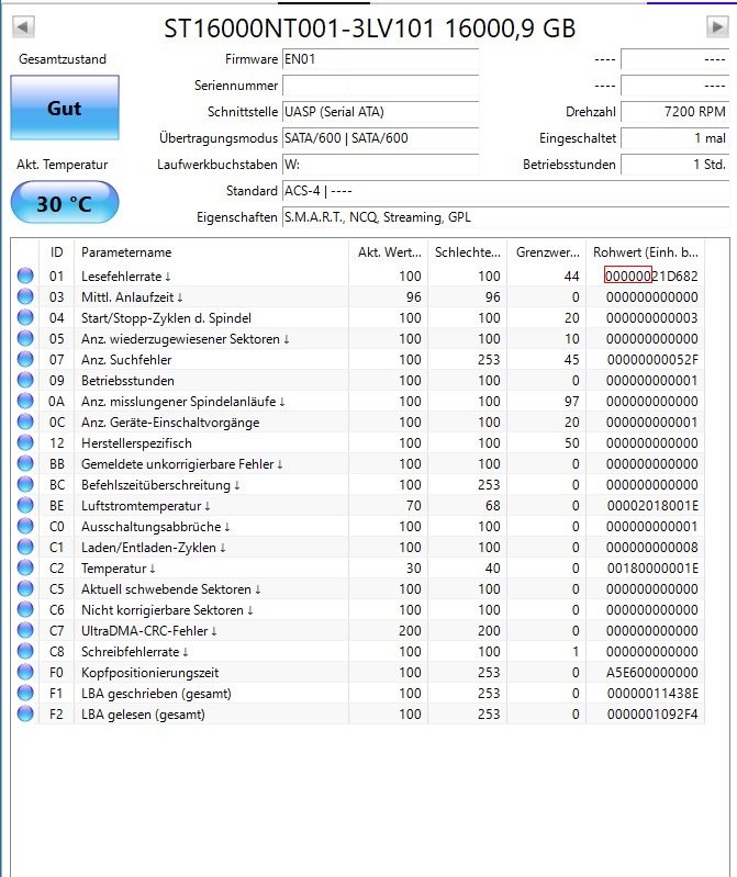 Ich hänge mal ein Screenshot der Smart-Werte mit an. Ist es etwa normal, dass die Lesefehlerrate schon neu einen solchen Wert hat?