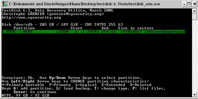 Starte Testdisk und wähle wenn nötig deine Festplatte aus.