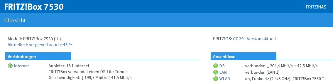 Bin ebenfalls bei 1und1, die Leitung läuft bei einer angezeigten Länge von 263m mit einem Sync von 264,51MBit/s Download und 46,71MBit/s Download.
