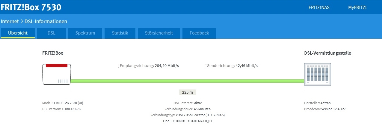 Bei mir sagt die FB was von 341m Leitungslänge und ich bin jetzt recht stabil bei effektiven 191 MBit/s. Mit "nur" 225m sollte da also deutlich mehr gehen als 199 MBit/s, aber da werden eben andere Faktoren ungünstiger sein. Deshalb wäre die Seite "DSL" so wichtig zu sehen.