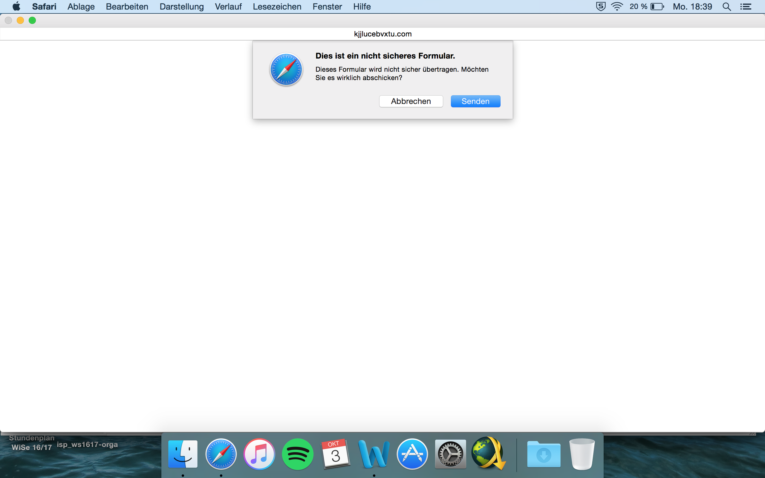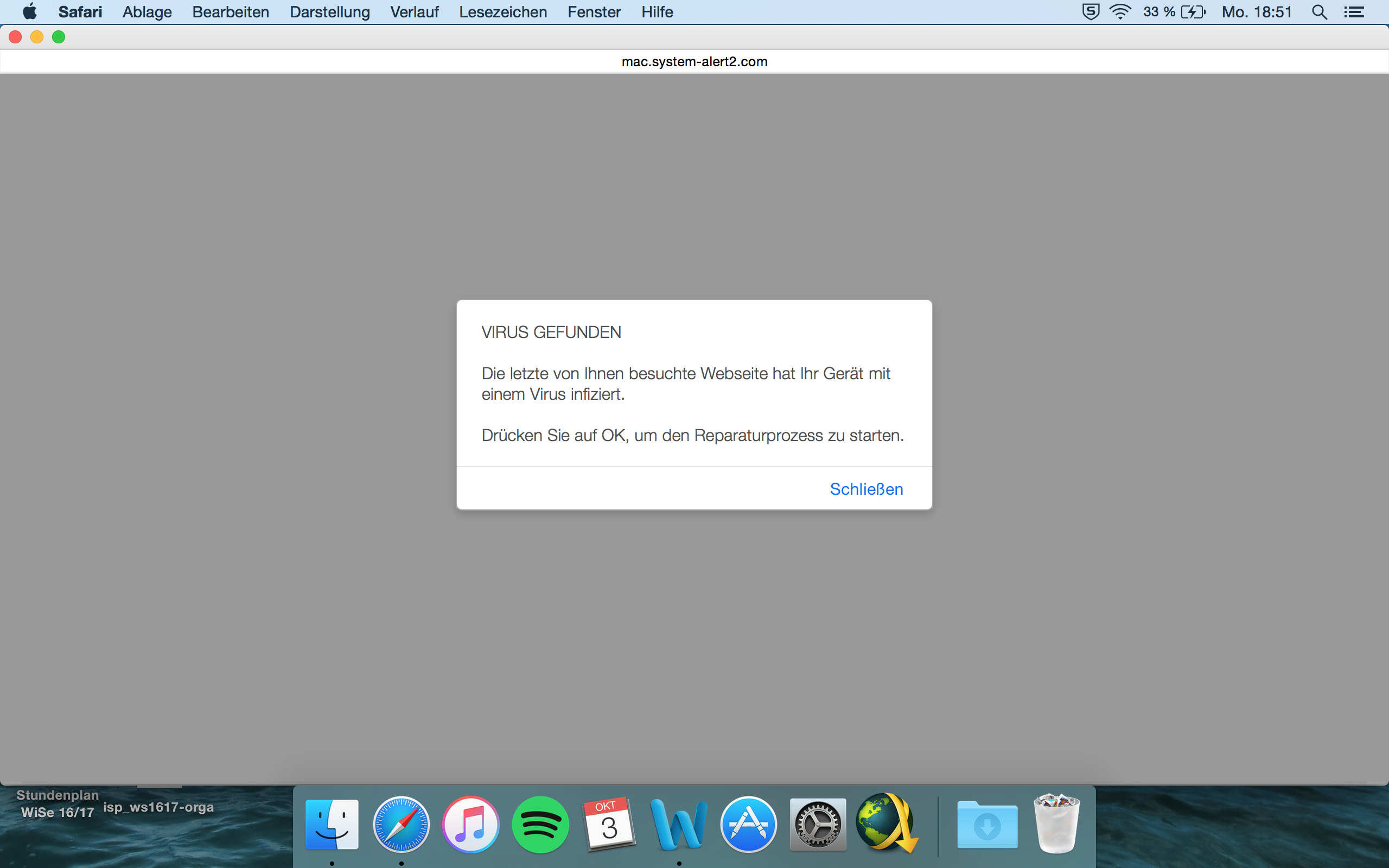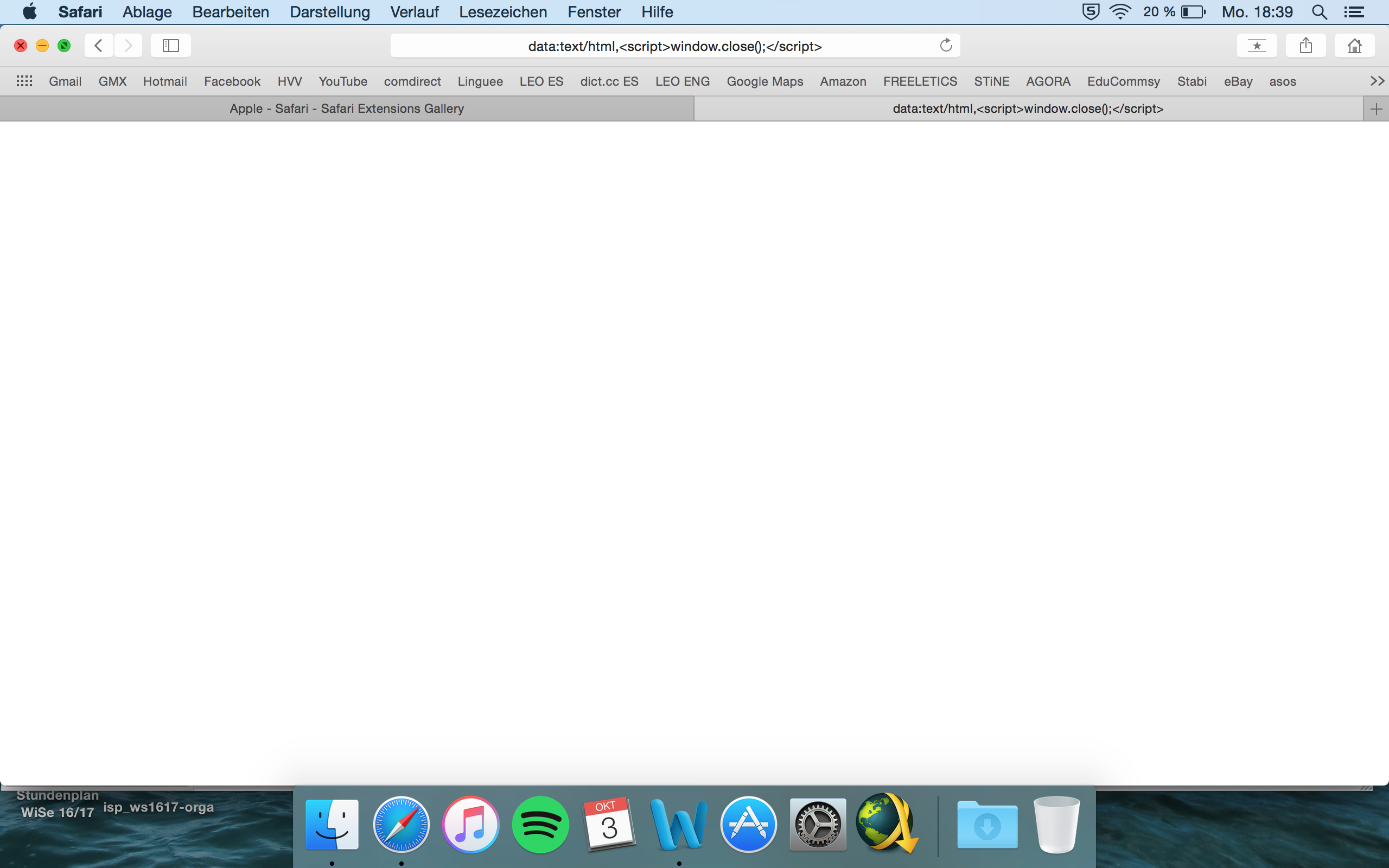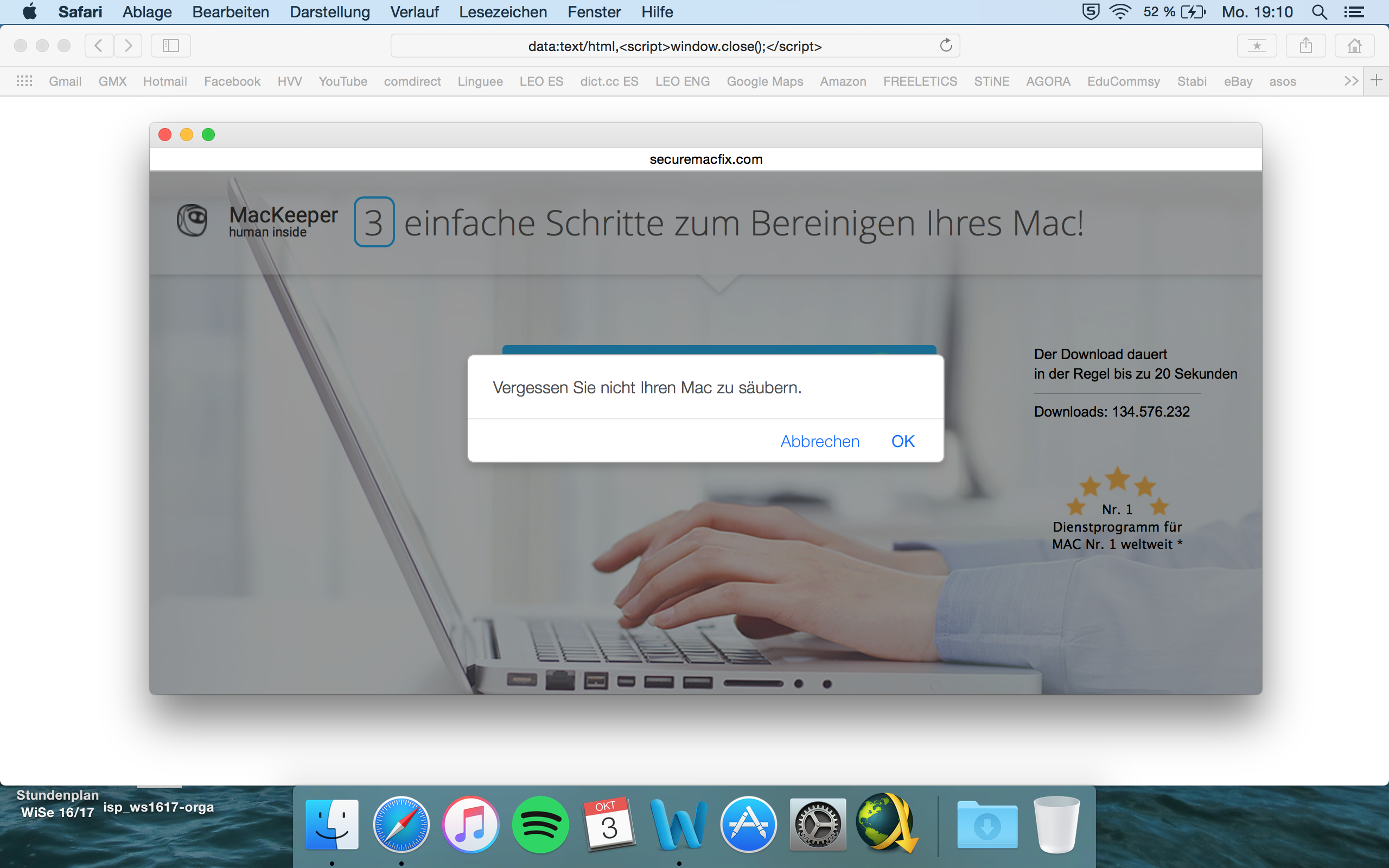 Wenn ich in Safari auf die Internetseite movie-blog.org gehe, öffnet sich bei einem Klick auf die Seite ein neues Browserfenster, in dem Meldungen kommen wie "dies ist kein sicheres Formular" oder "securemacfix". Beim Schließen dieser Fenster, bleibt bei der ursprünglichen Seite von movie-blog.org nur ein Browserfenster mit diesem Link übrig: data:text/html,<script>window.close();</script>