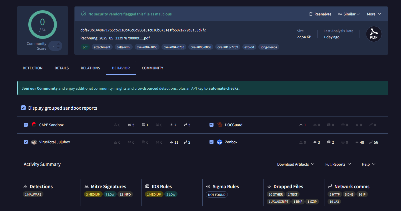 -eine Sandbox hat das als Malware eingestuft zusammen mit einem 100 Seitigen Logfile, was ich nicht verstehe. auf Wunsch generiere ich das noch einmal und kann es hier anhängen.
