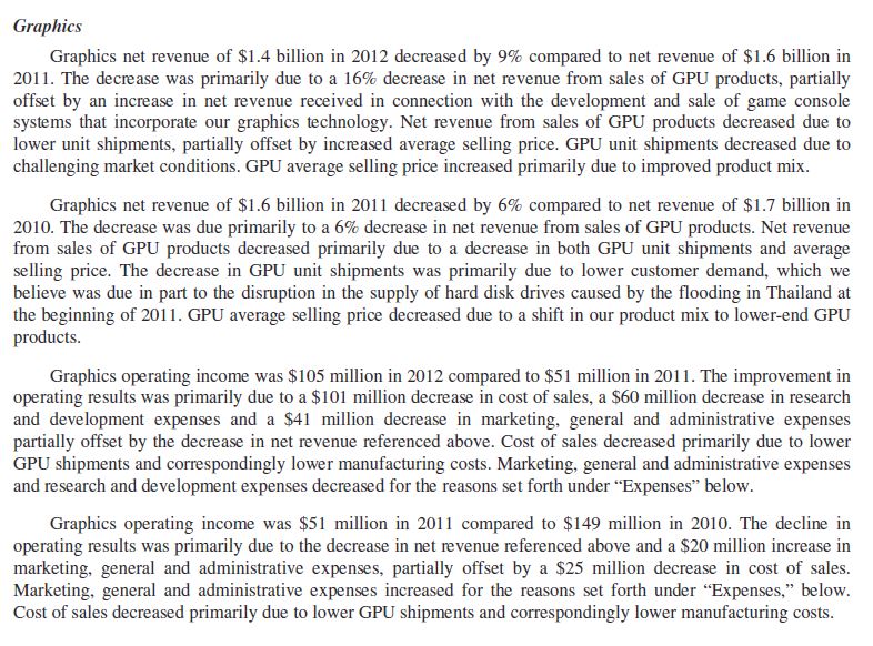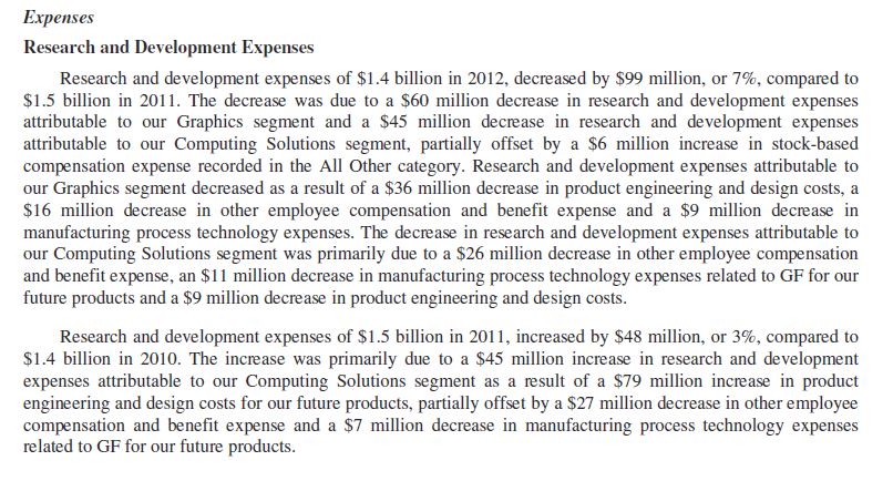 3.) Laut den Textpassagen oben hat also AMD in 2012 das R&D Budget für GPU sogar um 60 Mio. gekürzt - sowie um weitere 45Mio $ im Bereich Computing Solutions. Für den Bereich GPU waren die Hauptursachen für diesen Rückgang, weniger Lohnzahlungen/Boni sowie 36Mio $ Ersparnis beim Product Design/ Product Engineering sowie 9Mio $ erparnis in manufacturing cost R&D Bedingt (also test samples)