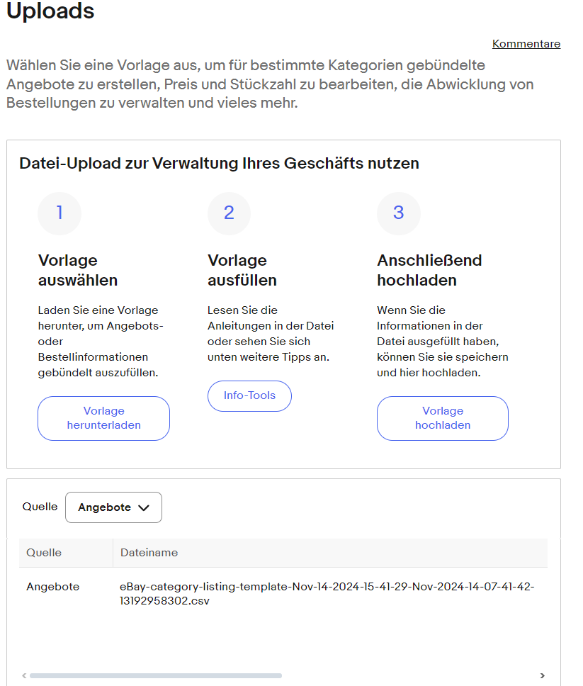 Ich habe versucht, eine CSV-Datei zu erstellen, um den Import damit vorzunehmen, aber ich kann auf eBay keine CSV-Datei exportieren, da dort aktuell keine Produkte als CSV zur Verfügung stehen. Wie man auf dem Bild sieht, sieht man unten bei der Quelle die Angebote, aber in dieser CSV-Datei sind keine Angebote drinnen.