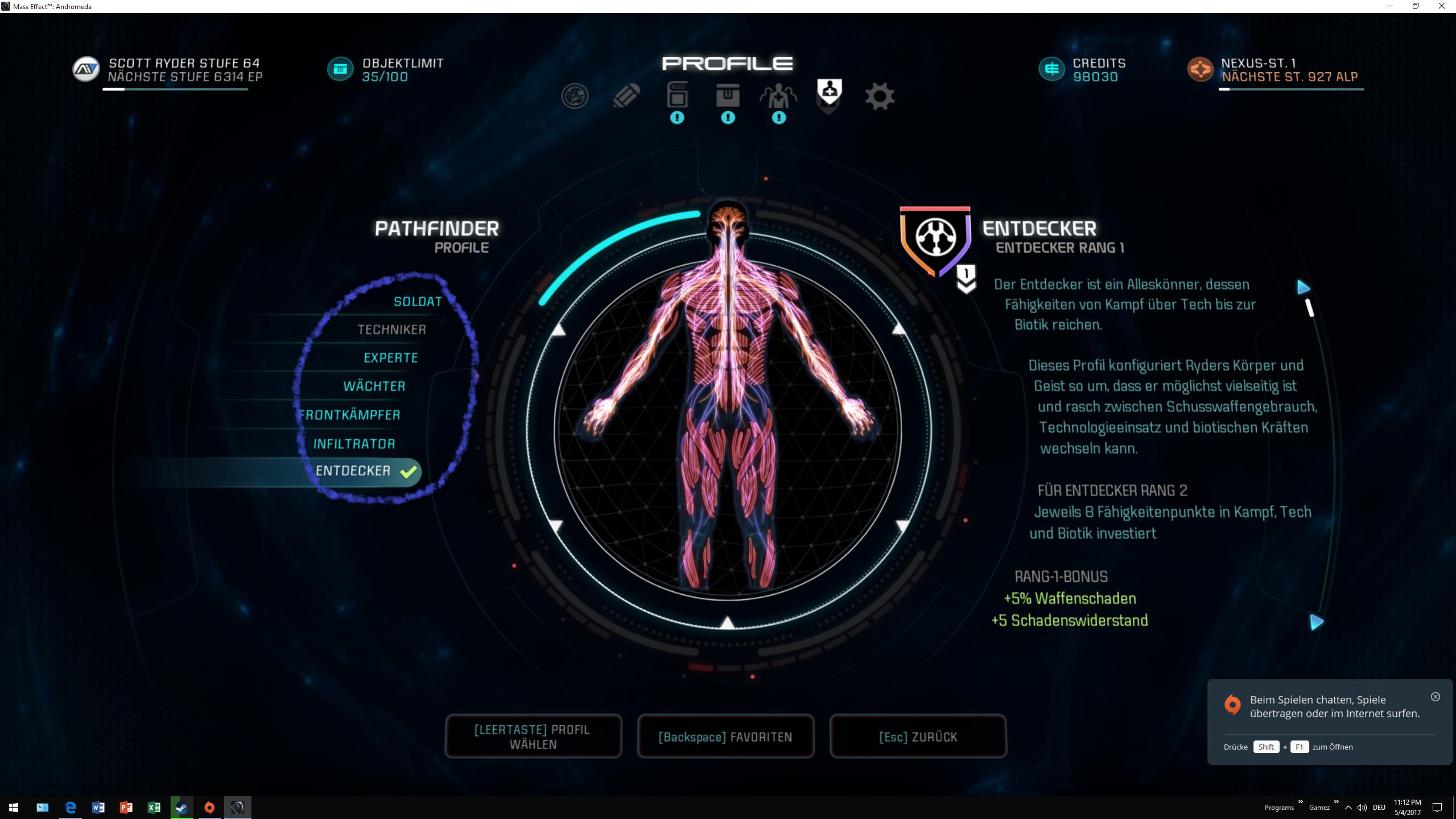 Du wählst ein Profil aus, z.B. das Entdecker-Profil (ist nebenbei das beste Allroundprofil in dem Spiel).