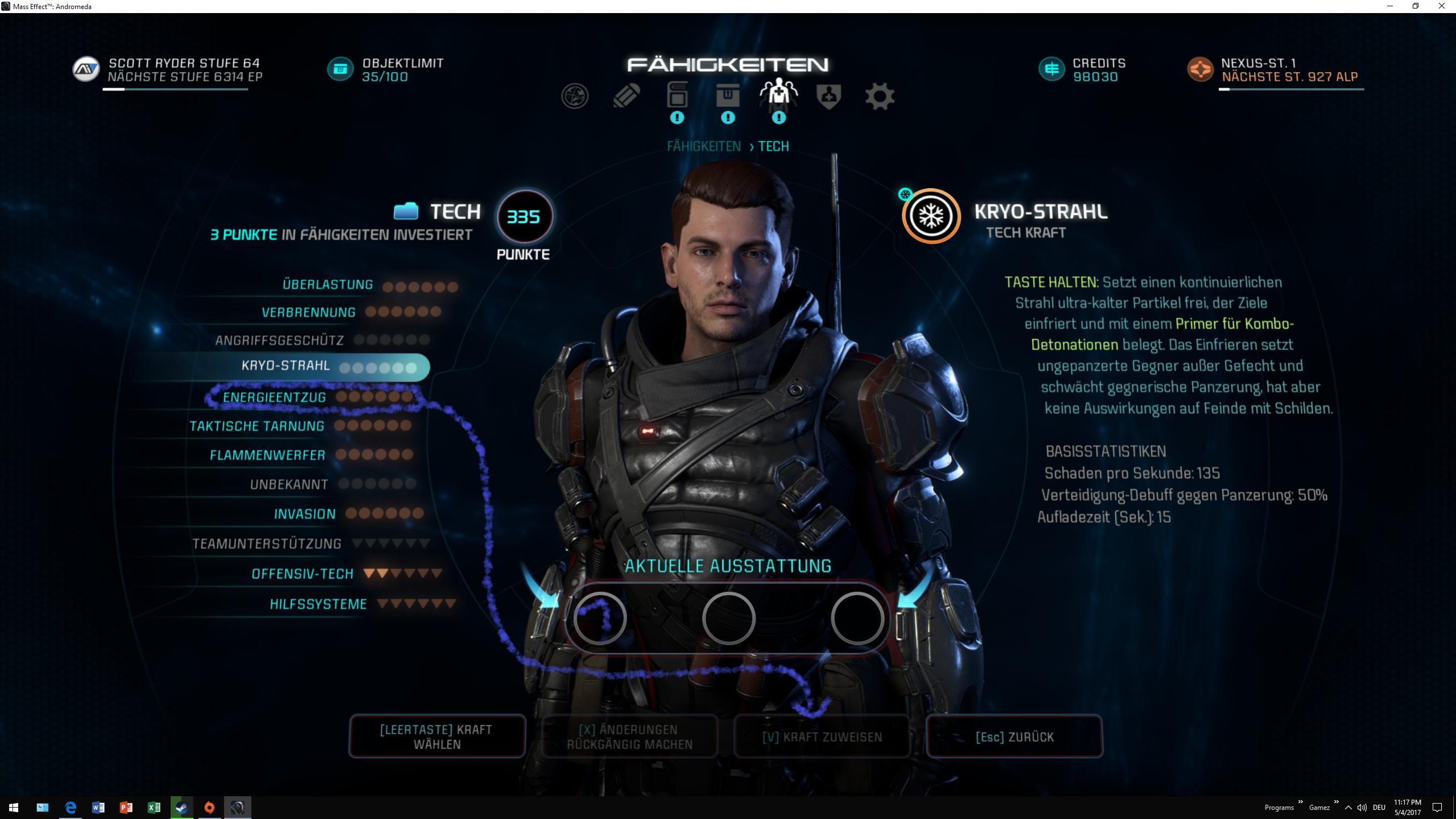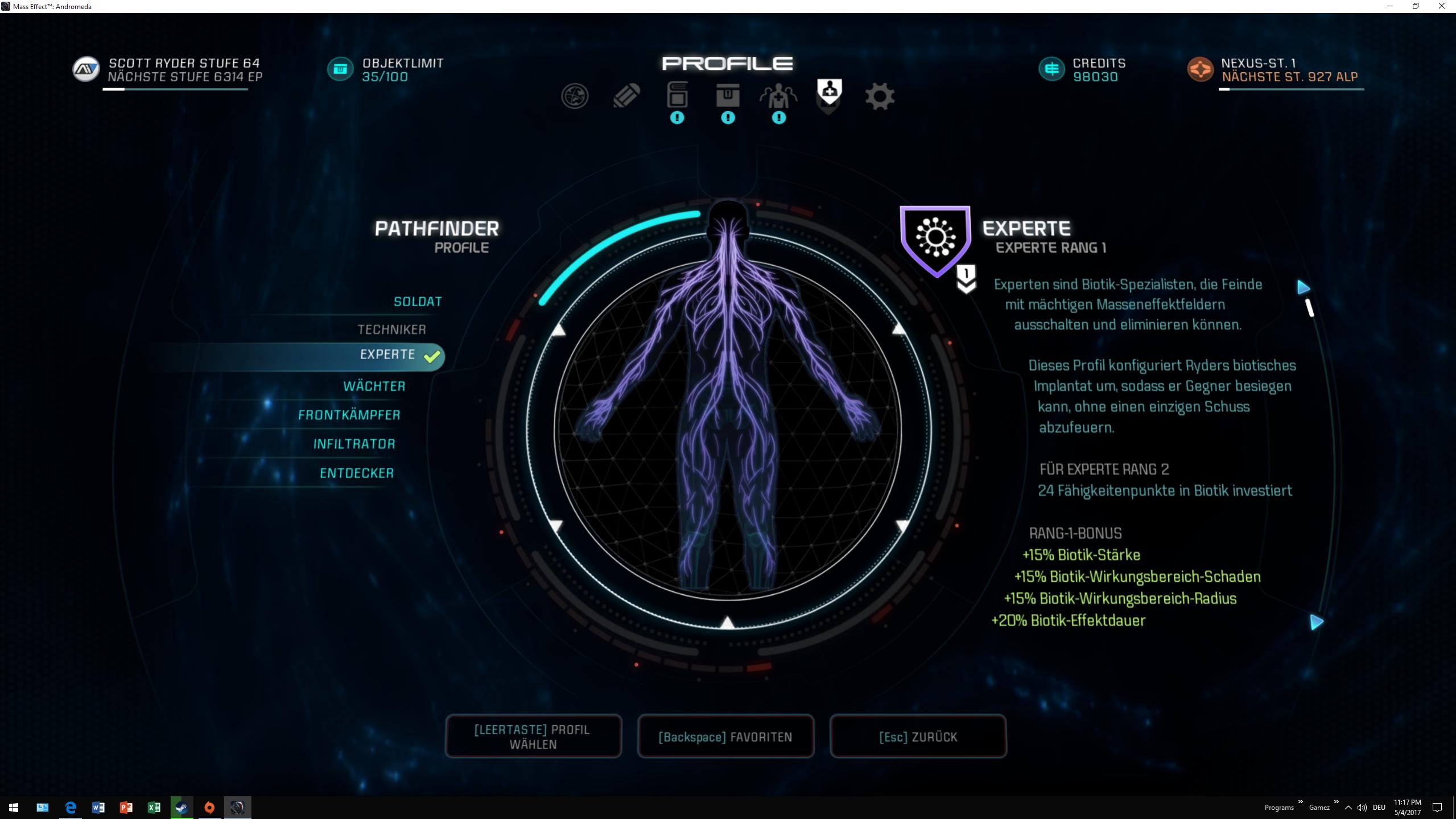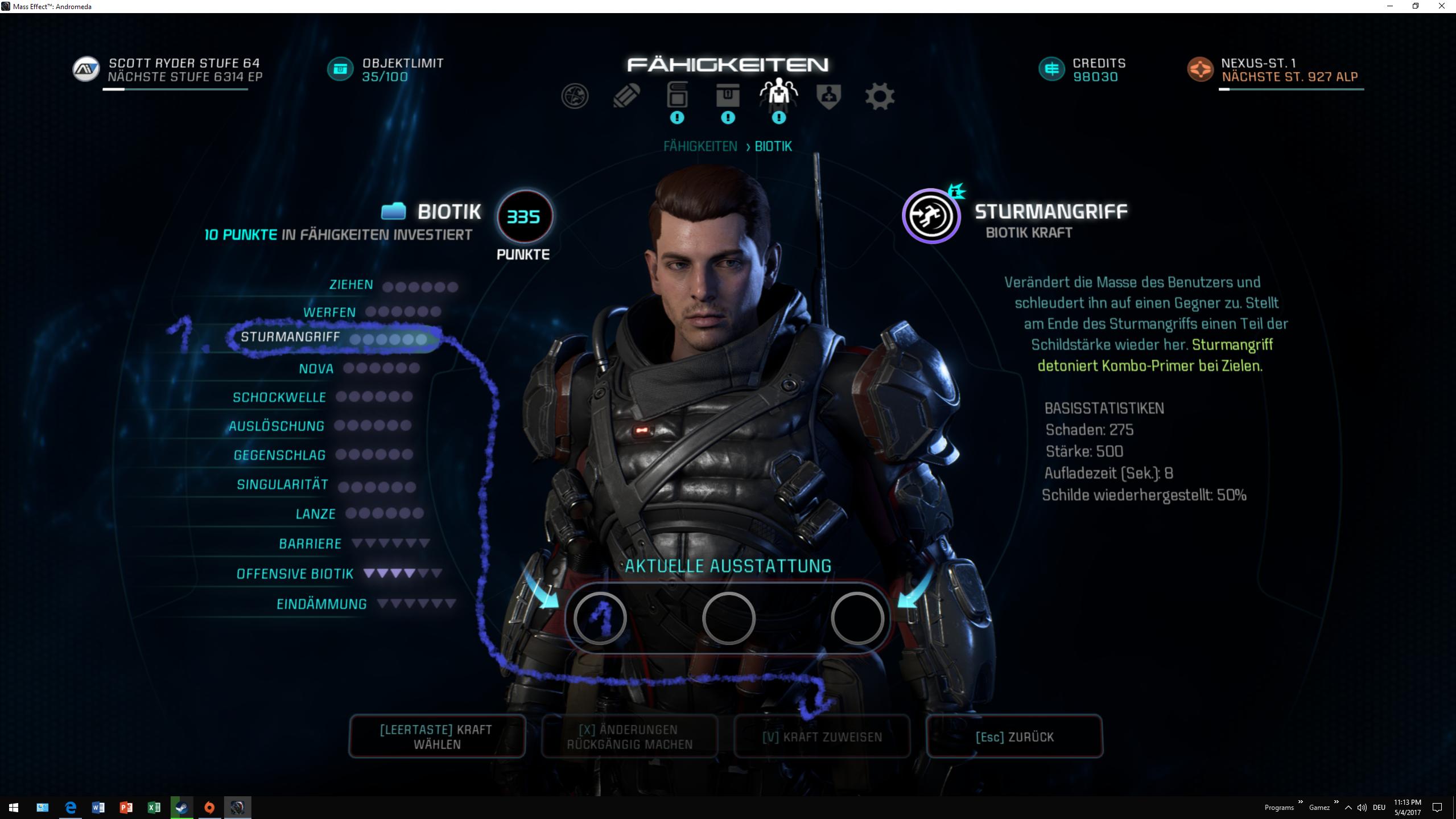 Danach gehst du in deinen Fähigkeiten-Index und klickt z.B. auf Biotik und dir werden die in dem Spiel verfügbaren Kräfte aufgelistet. Mit "V" kannst du eine Kraft zuweisen. Dann hast du z.B. als primäre Fähigkeit Sturmangriff mit V dem Entdecker-Profil zugewiesen.