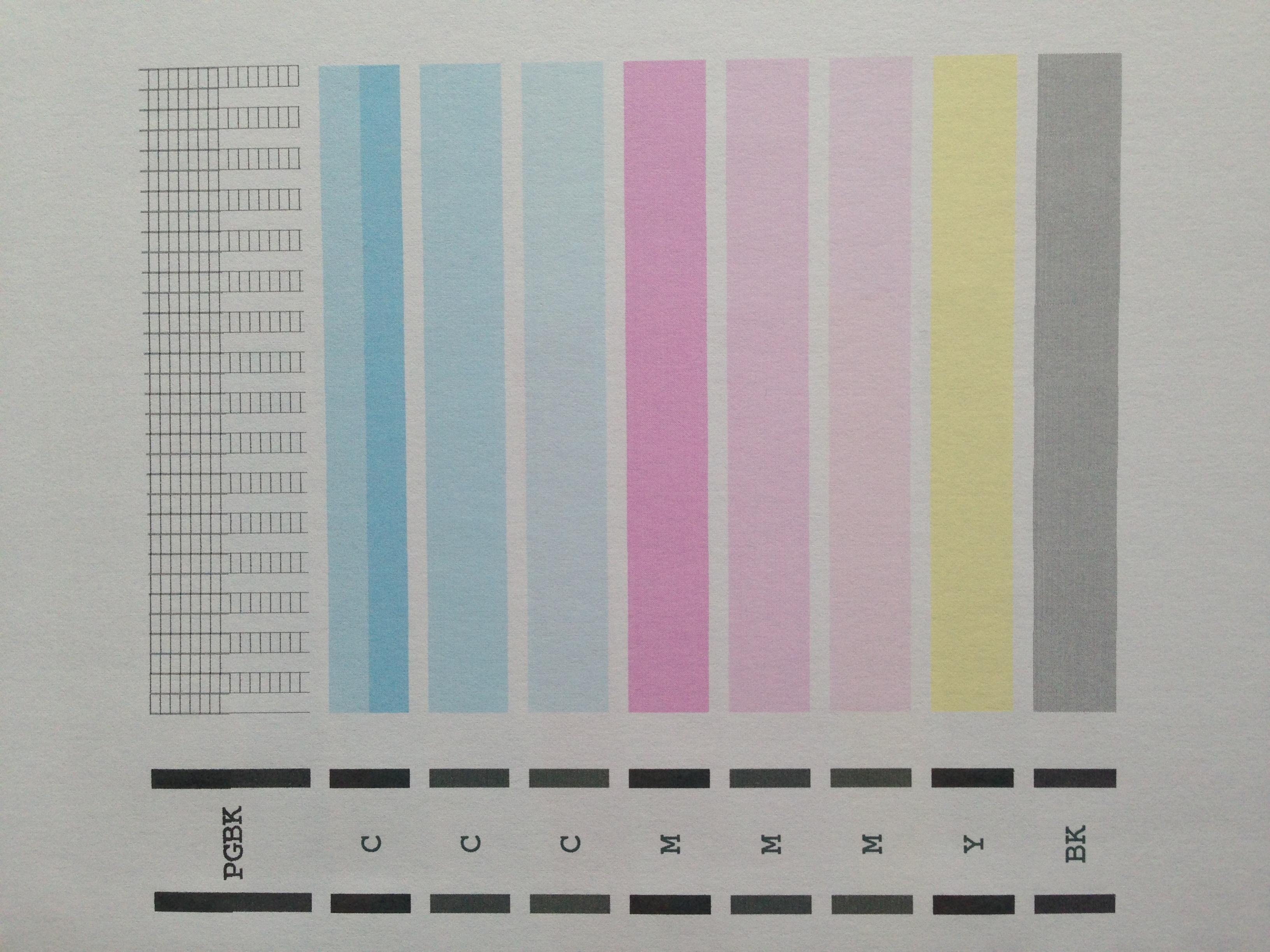 Es scheint als habe sich der Druckkopf nach der Reinigung erst wieder mit Tinte vollsaugen müssen. Jetzt sieht das Testbild wieder aus wie am Anfang, also zwar ein flächiger Druck aber mit dem Problem bei schwarz und blau.