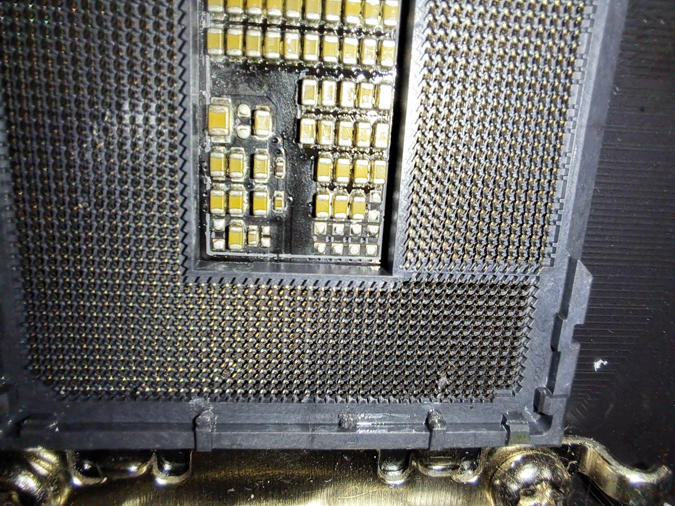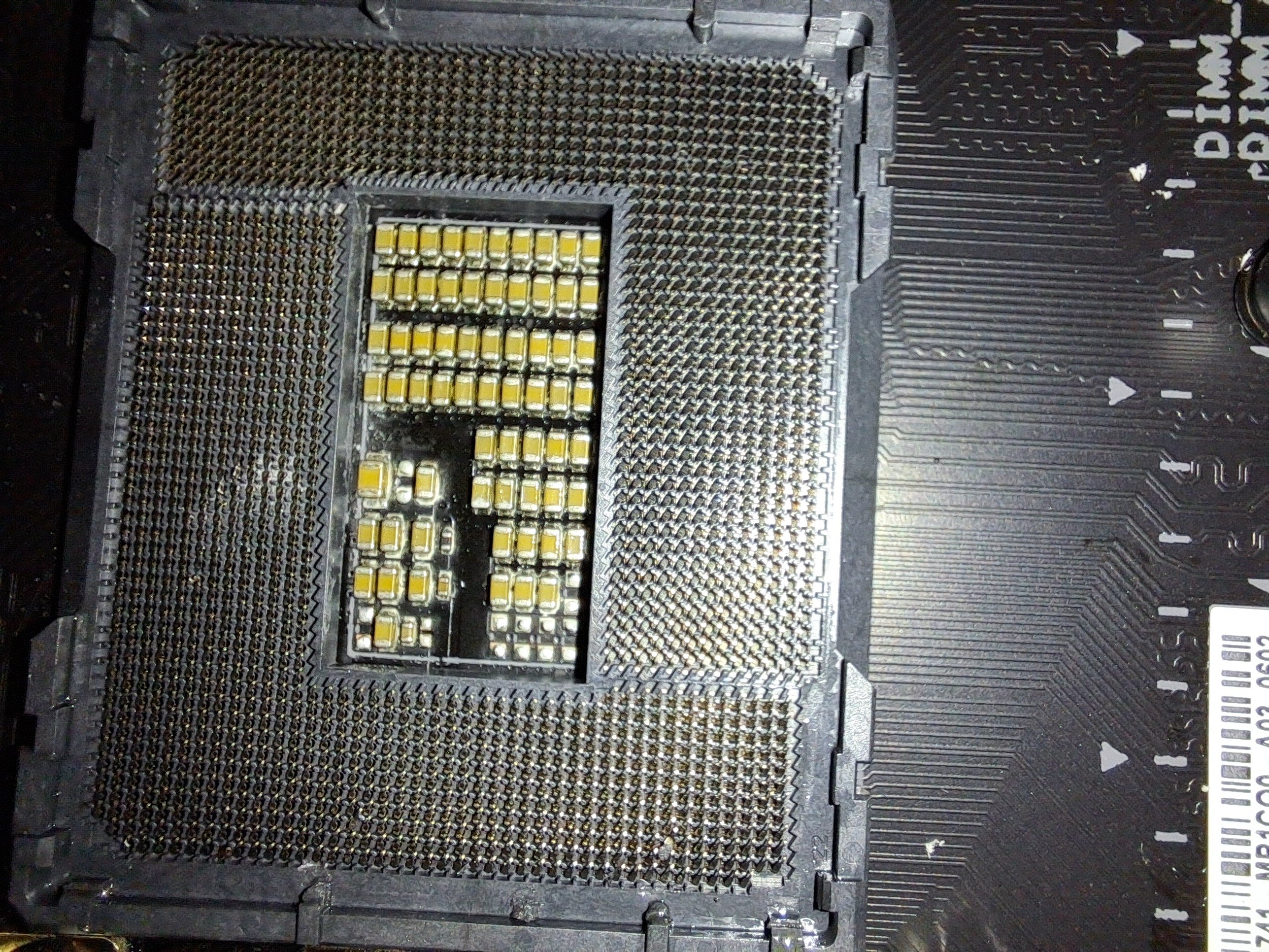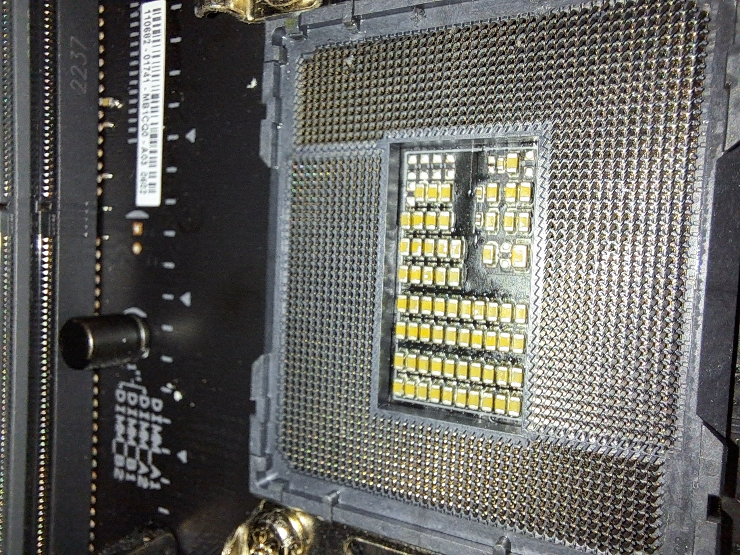 Diese CPU habe ich jetzt erfolgreich bei Intel umtauschen lassen und heute eingebaut. Allerdings läuft das System trotz des aktuellen BIOS-Updates für das Mainboard gefühlt schlechter als zuvor; es ist direkt nach 10 Minuten wieder abgestürzt. Jetzt überlege ich, ob ich vielleicht das Mainboard beschädigt habe – auf den Fotos sieht man, dass ein paar Pins unschön anders als der Rest aussehen. Außerdem habe ich leider Wärmeleitpaste (links) auf den Sockel gekleckert. Diese war schon zu sehr angetrocknet, als dass ich sie noch entfernen konnte (ich habe es probiert).
