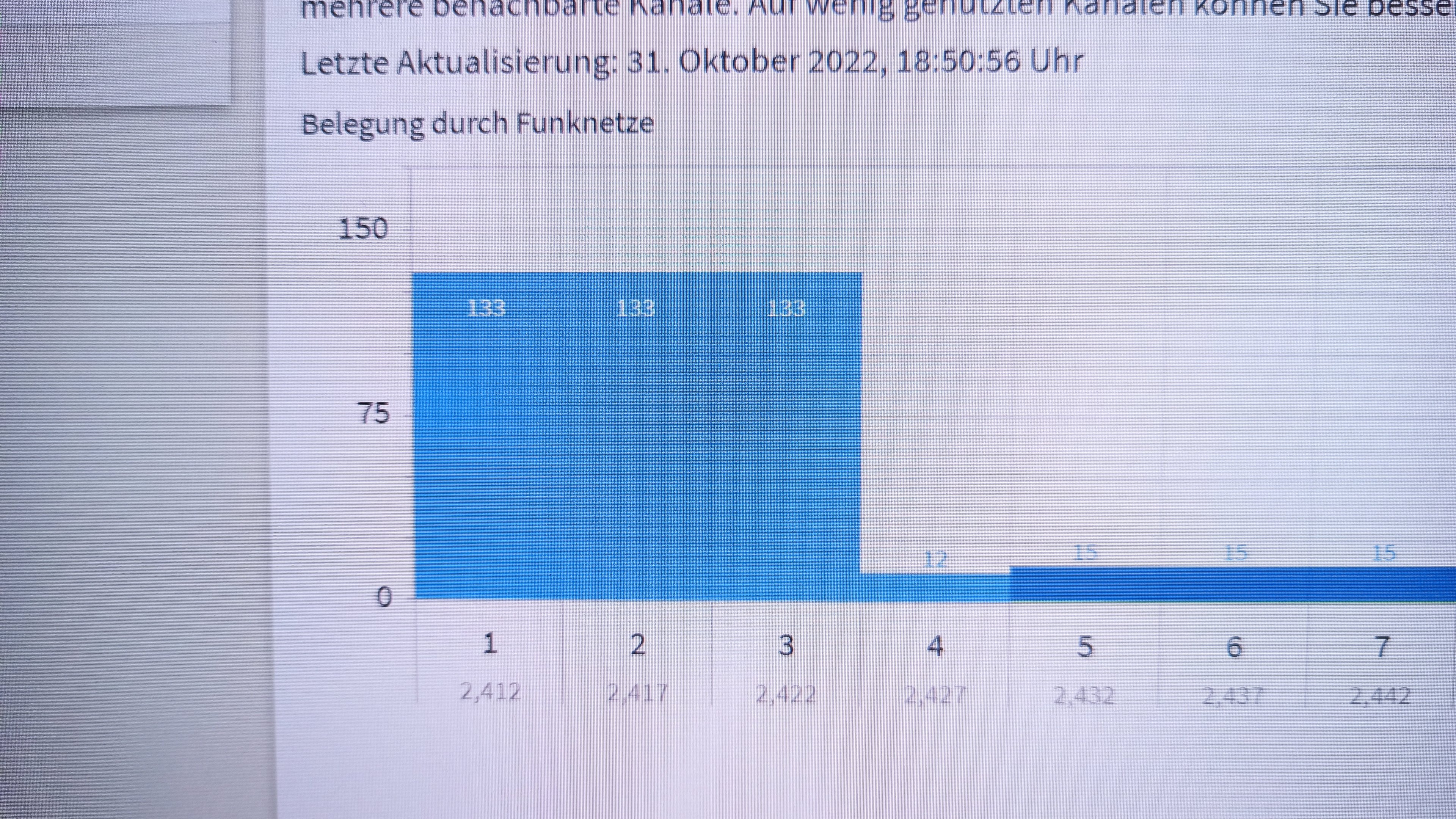 Jetzt habe ich mal in den Router geschaut und habe gesehen dass 2,4ghz Kanal 1 massiv überlastet ist, statt der üblichen ~7 WLAN werden hier weit über 100 angezeigt, und so massiv wie die Störung sind mit voller Auslastung in der Grafik sind die anscheinend auch wirklich vorhanden, nur sind hier um uns rum nur einzelhäuser, und auch kaum Verkehr auf der Straße.