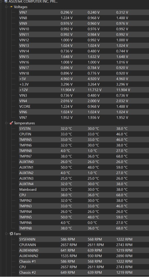 Wenn ich Games wie FC24 und Formel 1 spiele und kurz pausiere und dann weiter spiele, ruckeln die Spiele dermaßen arg. Dann dauert es ein wenig, bis die Ruckler weggehen und das Spiel wieder flüssig wird. Bei Battlefield 2042 zb. ist es nicht vorhanden. Habe mal noch ein Screenshot vom HWMonitor gemacht. Kann es auch sein, das Netzteil die Grätsche macht?