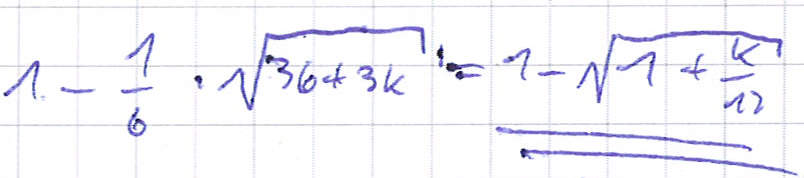 Ganz einfach : Klammer unter der Wurzel die 36 mal aus. dann steht unter der Wurzel 36(1+3k/36) und das ist halt (1+k/12) die 36 ist ja 6 im Quadrat und die Quadratwurzel aus 6 hoch 2 ist halt 6 und (1/6)*6 gibt halt 1 und 1 mal die Wurzel ist halt die Wurzel sonst bleiben die einzelnen Summanden jedoch bleiben erhalten und fertig.